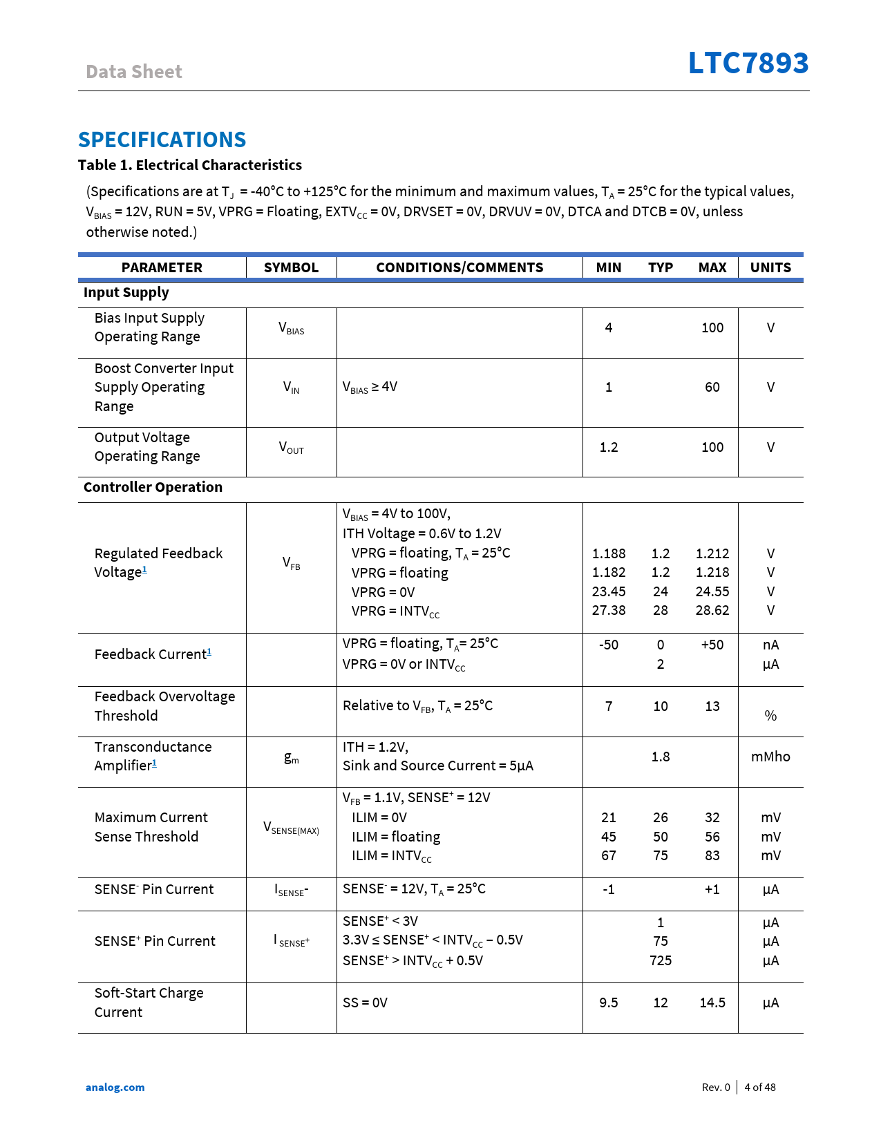 Pages / Page48 / 4 — Data Sheet. LTC7893. SPECIFICATIONS Table 1. Electrical Characteristics. …