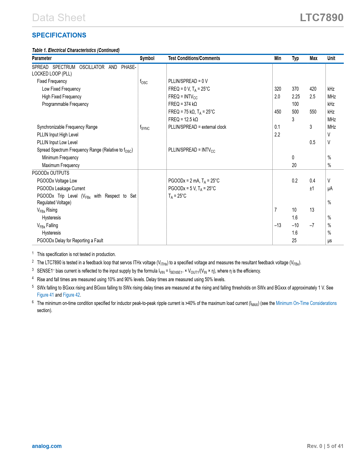 link to page 24 link to page 24 link to page 29 Data Sheet LTC7890SPECIFICATIONSTable 1. Electrical Characteristics (Continued)ParameterSymbolTest Conditions/CommentsMinTypMaxUnit SPREAD SPECTRUM OSCILLATOR AND PHASE- LOCKED LOOP (PLL) Fixed Frequency fOSC PLLIN/SPREAD = 0 V Low Fixed Frequency FREQ = 0 V, TA = 25°C 320 370 420 kHz High Fixed Frequency FREQ = INTVCC 2.0 2.25 2.5 MHz Programmable Frequency FREQ = 374 kΩ 100 kHz FREQ = 75 kΩ, TA = 25°C 450 500 550 kHz FREQ = 12.5 kΩ 3 MHz Synchronizable Frequency Range fSYNC PLLIN/SPREAD = external clock 0.1 3 MHz PLLIN Input High Level 2.2 V PLLIN Input Low Level 0.5 V Spread Spectrum Frequency Range (Relative to fOSC) PLLIN/SPREAD = INTVCC Minimum Frequency 0 % Maximum Frequency 20 % PGOODx OUTPUTS PGOODx Voltage Low PGOODx = 2 mA, TA = 25°C 0.2 0.4 V PGOODx Leakage Current PGOODx = 5 V, TA = 25°C ±1 µA PGOODx Trip Level (VFBx with Respect to Set TA = 25°C Regulated Voltage) % VFBx Rising 7 10 13 Hysteresis 1.6 % VFBx Falling –13 –10 –7 % Hysteresis 1.6 % PGOODx Delay for Reporting a Fault 25 μs 1 This specification is not tested in production. 2 The LTC7890 is tested in a feedback loop that servos ITHx voltage (VITHx) to a specified voltage and measures the resultant feedback voltage (VFBx). 3 SENSE1– bias current is reflected to the input supply by the formula IVIN = ISENSE1– × VOUT1/(VIN × η), where η is the efficiency. 4 Rise and fall times are measured using 10% and 90% levels. Delay times are measured using 50% levels. 5 SWx falling to BGxxx rising and BGxxx falling to SWx rising delay times are measured at the rising and falling thresholds on SWx and BGxxx of approximately 1 V. See Figure 41 and Figure 42. 6 The minimum on-time condition specified for inductor peak-to-peak ripple current is >40% of the maximum load current (IMAX) (see the Minimum On-Time Considerations section). analog.comRev. 0 | 5 of 41 Document Outline Features Applications Typical Application Circuit General Description Specifications Electrical Characteristics Absolute Maximum Ratings ESD Caution Pin Configuration and Function Descriptions Typical Performance Characteristics Theory of Operation Functional Diagram Main Control Loop Power and Bias Supplies (VIN, EXTVCC, DRVCC, and INTVCC) High-Side Bootstrap Capacitor Dead Time Control (DTCA and DTCB Pins) Startup and Shutdown (RUNx and TRACK/SSx Pins) Light Load Operation: Burst Mode Operation, Pulse Skipping Mode, or Forced Continuous Mode (MODE Pin) Frequency Selection, Spread Spectrum, and Phase-Locked Loop (FREQ and PLLIN/SPREAD Pins) Output Overvoltage Protection Foldback Current Power-Good Applications Information Inductor Value Calculation Inductor Core Selection Current Sense Selection Low Value Resistor Current Sensing Inductor DCR Current Sensing Setting the Operating Frequency Selecting the Light Load Operating Mode Dead Time Control (DTCA and DTCB Pins) DTCx Pins Tied to GND (Adaptive Dead Time Control) DTCx Pins Tied to INTVCC (Smart Near Zero Dead Time Control) DTCx Pins Connected with a Resistor to GND Power FET Selection CIN and COUT Selection Setting the Output Voltage RUNx Pins and Undervoltage Lockout Soft Start and Tracking (TRACK/SSx Pin) 2-Phase Single Output Operation INTVCC Regulators (OPTI-DRIVE) Topside FET Driver Supply (CB) Minimum On-Time Considerations Fault Conditions: Current Limit and Foldback Fault Conditions: Overvoltage Protection Fault Conditions: Overtemperature Protection Phase-Locked Loop and Frequency Synchronization Efficiency Considerations Checking Transient Response Design Example PCB Layout Checklist PCB Layout Debugging Typical Applications Related Products Outline Dimensions Ordering Guide Evaluation Boards