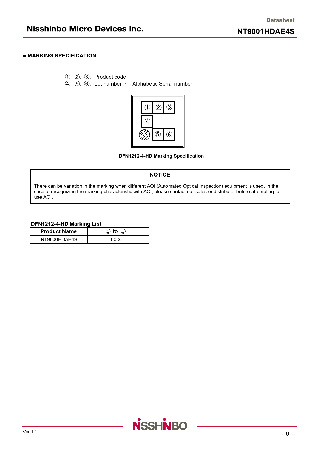 Datasheet. NT9001HDAE4S. ■ MARKING SPECIFICATION. DFN1212-4-HD Marking Specification. NOTICE. DFN1212-4-HD Marking List
