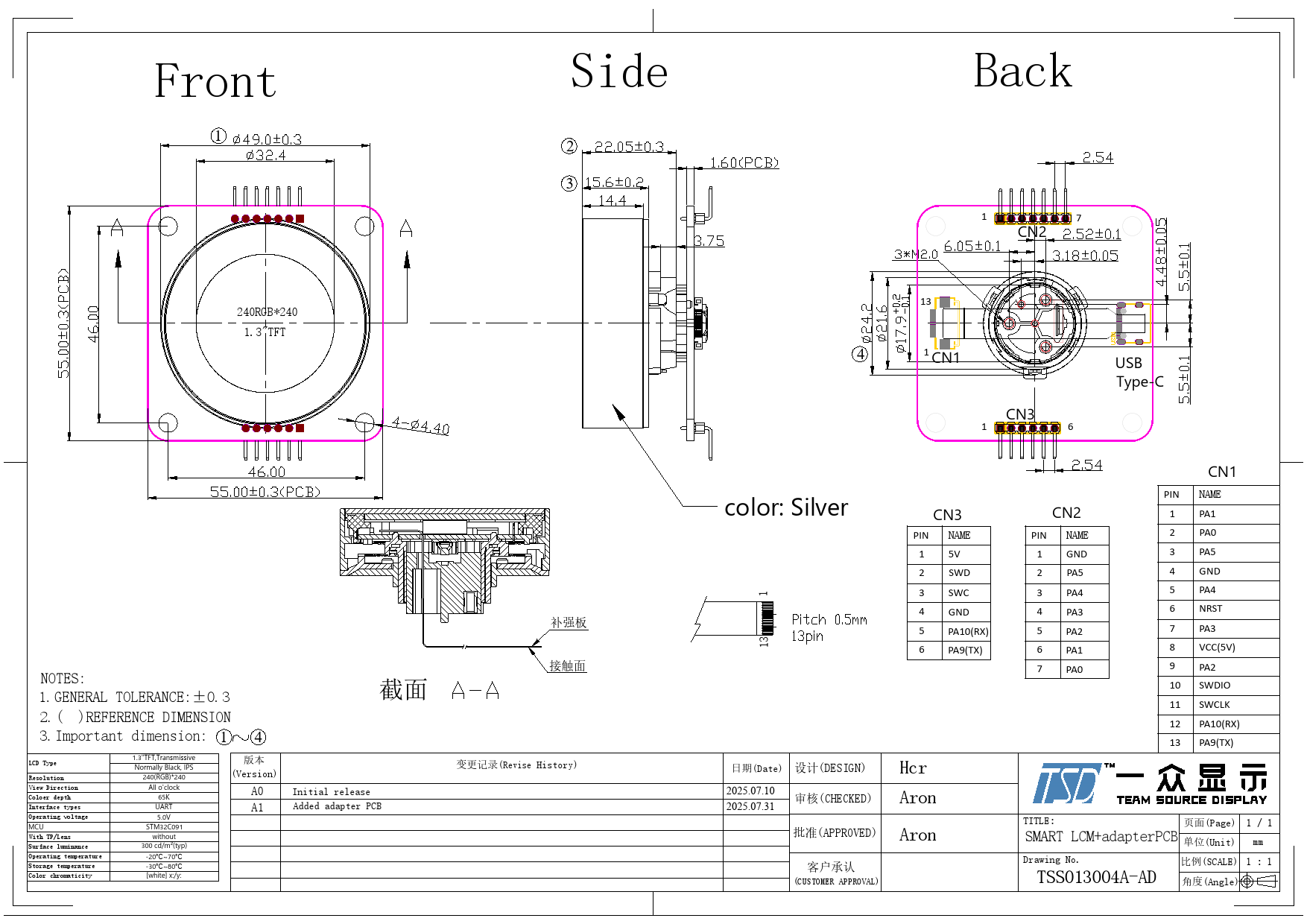 Front. Side. Back. 1. 2. 3. 1. 7. CN2. 13. 240RGB*240. 1.3"TFT. 4. 1. CN1. USB. Type-C. CN3. 1. 6. CN1. PIN. NAME. color:. Silver. CN3. CN2. 1. PA1. 2. PA0. PIN. NAME. PIN. NAME. 1. 5V. 1