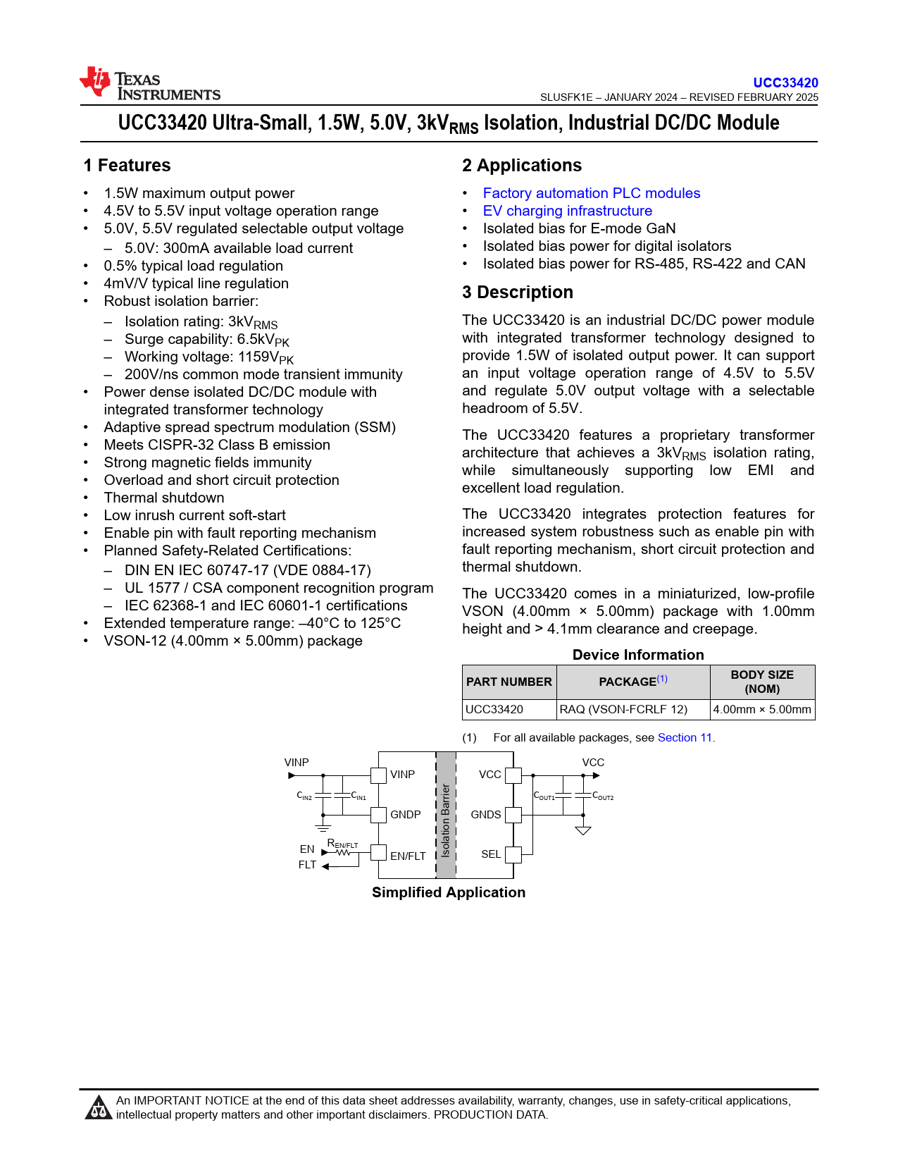 link to page 1 link to page 28 UCC33420 SLUSFK1E – JANUARY 2024 – REVISED FEBRUARY 2025 UCC33420 Ultra-Small, 1.5W, 5.0V, 3kVRMS Isolation, Industrial DC/DC Module1 Features2 Applications • 1.5W maximum output power • Factory automation PLC modules • 4.5V to 5.5V input voltage operation range • EV charging infrastructure • 5.0V, 5.5V regulated selectable output voltage • Isolated bias for E-mode GaN – 5.0V: 300mA available load current • Isolated bias power for digital isolators • 0.5% typical load regulation • Isolated bias power for RS-485, RS-422 and CAN • 4mV/V typical line regulation 3 Description • Robust isolation barrier: – Isolation rating: 3kVRMS The UCC33420 is an industrial DC/DC power module – Surge capability: 6.5kVPK with integrated transformer technology designed to – Working voltage: 1159VPK provide 1.5W of isolated output power. It can support – 200V/ns common mode transient immunity an input voltage operation range of 4.5V to 5.5V • Power dense isolated DC/DC module with and regulate 5.0V output voltage with a selectable integrated transformer technology headroom of 5.5V. • Adaptive spread spectrum modulation (SSM) The UCC33420 features a proprietary transformer • Meets CISPR-32 Class B emission architecture that achieves a 3kV • Strong magnetic fields immunity RMS isolation rating, while simultaneously supporting low EMI and • Overload and short circuit protection excellent load regulation. • Thermal shutdown • Low inrush current soft-start The UCC33420 integrates protection features for • Enable pin with fault reporting mechanism increased system robustness such as enable pin with • Planned Safety-Related Certifications: fault reporting mechanism, short circuit protection and – DIN EN IEC 60747-17 (VDE 0884-17) thermal shutdown. – UL 1577 / CSA component recognition program The UCC33420 comes in a miniaturized, low-profile – IEC 62368-1 and IEC 60601-1 certifications VSON (4.00mm × 5.00mm) package with 1.00mm • Extended temperature range: –40°C to 125°C height and > 4.1mm clearance and creepage. • VSON-12 (4.00mm × 5.00mm) package Device InformationPART NUMBERPACKAGE (1) BODY SIZE(NOM) UCC33420 RAQ (VSON-FCRLF 12) 4.00mm × 5.00mm (1) For all available packages, see Section 11. VINP VCC VINP VCC r C C C C IN2 IN1 rrie OUT1 OUT2 GNDP GNDS REN/FLT EN EN/FLT Isolation Ba SEL FLT Simplified Application An IMPORTANT NOTICE at the end of this data sheet addresses availability, warranty, changes, use in safety-critical applications, intellectual property matters and other important disclaimers. PRODUCTION DATA. Document Outline 1 Features 2 Applications 3 Description Table of Contents 4 Device Comparison 5 Pin Configuration and Functions 6 Specifications 6.1 Absolute Maximum Ratings 6.2 ESD Ratings 6.3 Recommended Operating Conditions 6.4 Thermal Information 6.5 Power Ratings 6.6 Insulation Specifications 6.7 Safety-Related Certifications 6.8 Safety Limiting Values 6.9 Electrical Characteristics 6.10 Typical Characteristics 7 Detailed Description 7.1 Overview 7.2 Functional Block Diagram 7.3 Feature Description 7.3.1 Enable and Disable 7.3.2 Output Voltage Soft-Start 7.3.3 Output Voltage Steady-State Regulation 7.3.4 Protection Features 7.3.4.1 Input Under-Voltage and Over-Voltage Lockout 7.3.4.2 Output Under-Voltage Protection 7.3.4.3 Output Over-Voltage Protection 7.3.4.4 Over-Temperature Protection 7.3.4.5 Fault Reporting and Auto-Restart 7.3.5 VCC Load Recommended Operating Area 7.3.6 Electromagnetic Compatibility (EMC) Considerations 7.4 Device Functional Modes 8 Application and Implementation 8.1 Application Information 8.2 Typical Application 8.2.1 Design Requirements 8.2.2 Detailed Design Procedure 8.3 Power Supply Recommendations 8.4 Layout 8.4.1 Layout Guidelines 8.4.2 Layout Example 9 Device and Documentation Support 9.1 Device Support 9.1.1 Third-Party Products Disclaimer 9.2 Documentation Support 9.2.1 Related Documentation 9.3 Receiving Notification of Documentation Updates 9.4 Support Resources 9.5 Trademarks 9.6 Electrostatic Discharge Caution 9.7 Glossary 10 Revision History 11 Mechanical and Packaging Information