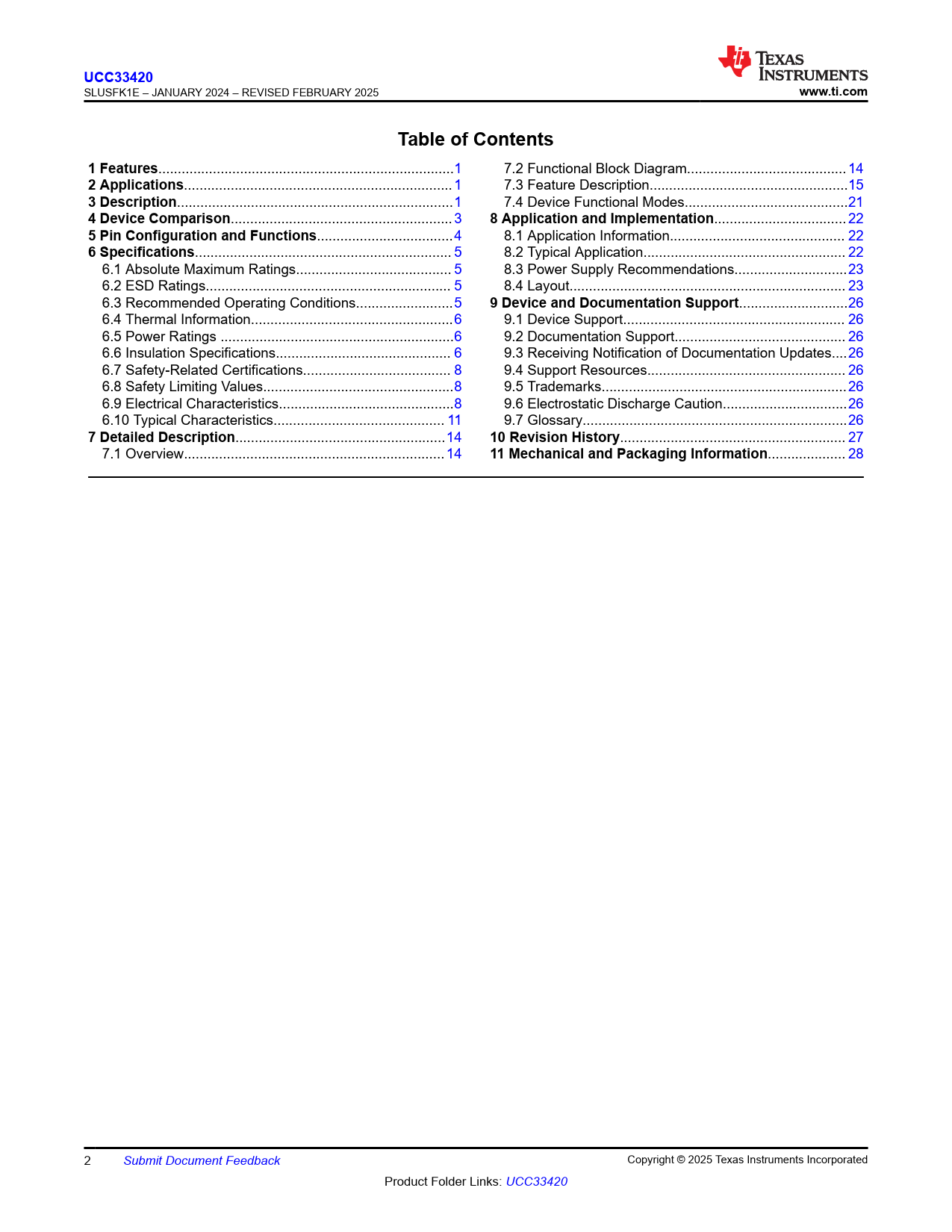 .. 28 2 Submit Document Feedback Copyright © 2025 Texas Instruments Incorporated Product Folder Links: UCC33420 Document Outline 1 Features 2 Applications 3 Description Table of Contents 4 Device Comparison 5 Pin Configuration and Functions 6 Specifications 6.1 Absolute Maximum Ratings 6.2 ESD Ratings 6.3 Recommended Operating Conditions 6.4 Thermal Information 6.5 Power Ratings 6.6 Insulation Specifications 6.7 Safety-Related Certifications 6.8 Safety Limiting Values 6.9 Electrical Characteristics 6.10 Typical Characteristics 7 Detailed Description 7.1 Overview 7.2 Functional Block Diagram 7.3 Feature Description 7.3.1 Enable and Disable 7.3.2 Output Voltage Soft-Start 7.3.3 Output Voltage Steady-State Regulation 7.3.4 Protection Features 7.3.4.1 Input Under-Voltage and Over-Voltage Lockout 7.3.4.2 Output Under-Voltage Protection 7.3.4.3 Output Over-Voltage Protection 7.3.4.4 Over-Temperature Protection 7.3.4.5 Fault Reporting and Auto-Restart 7.3.5 VCC Load Recommended Operating Area 7.3.6 Electromagnetic Compatibility (EMC) Considerations 7.4 Device Functional Modes 8 Application and Implementation 8.1 Application Information 8.2 Typical Application 8.2.1 Design Requirements 8.2.2 Detailed Design Procedure 8.3 Power Supply Recommendations 8.4 Layout 8.4.1 Layout Guidelines 8.4.2 Layout Example 9 Device and Documentation Support 9.1 Device Support 9.1.1 Third-Party Products Disclaimer 9.2 Documentation Support 9.2.1 Related Documentation 9.3 Receiving Notification of Documentation Updates 9.4 Support Resources 9.5 Trademarks 9.6 Electrostatic Discharge Caution 9.7 Glossary 10 Revision History 11 Mechanical and Packaging Information