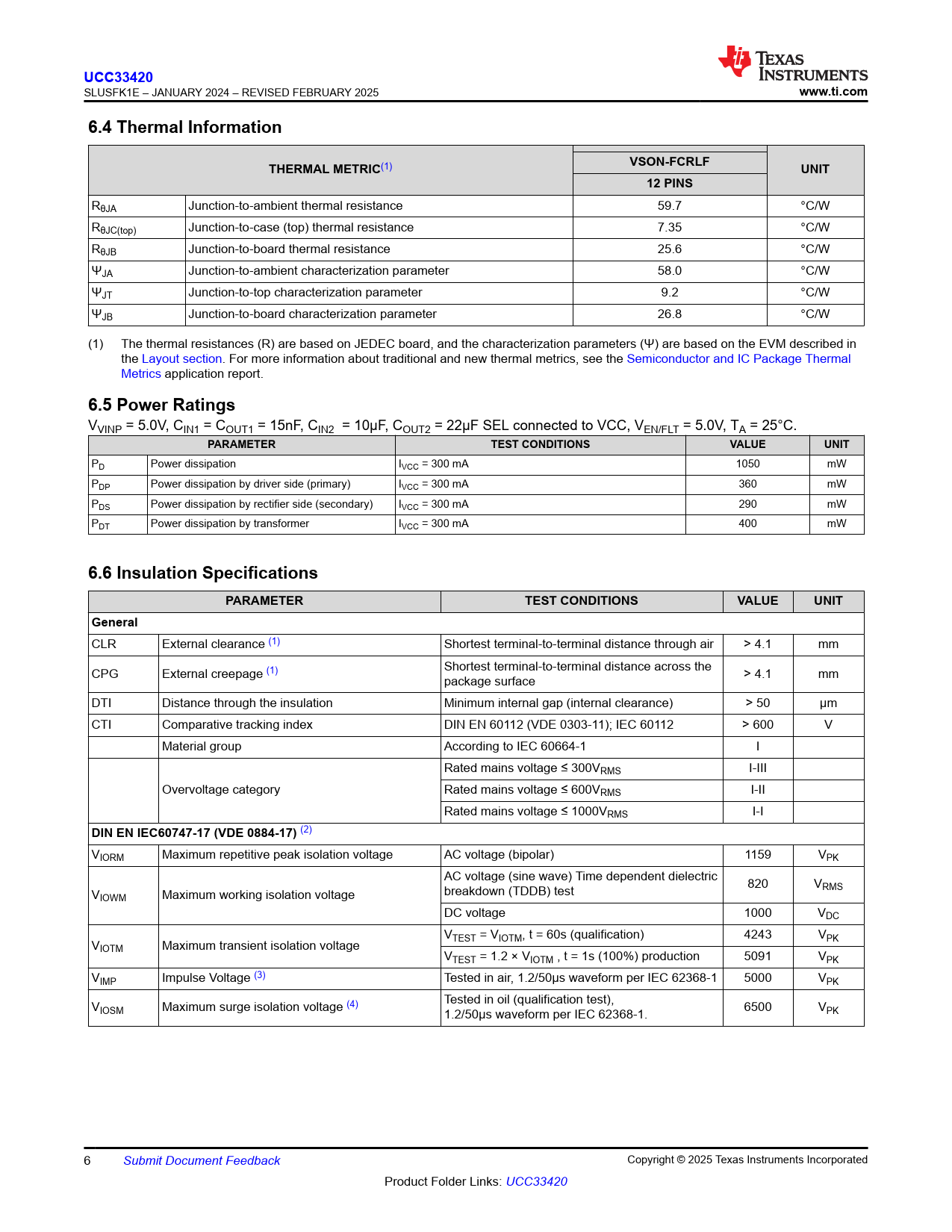 UCC33420. www.ti.com. 6.4 Thermal Information. VSON-FCRLF. THERMAL METRIC. UNIT. 12 PINS. 6.5 Power Ratings. PARAMETER. TEST CONDITIONS