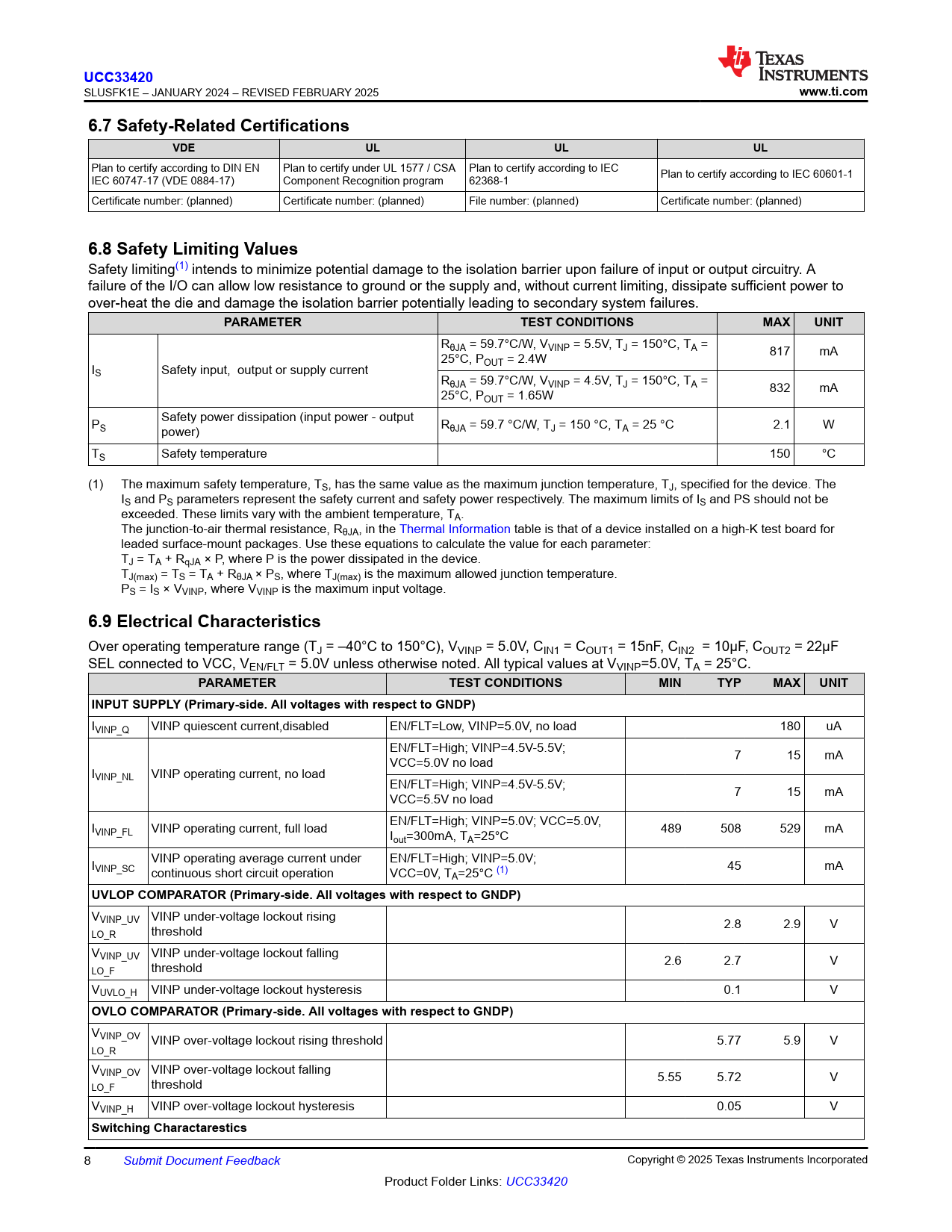 UCC33420. www.ti.com. 6.7 Safety-Related Certifications. VDE. 6.8 Safety Limiting Values. PARAMETER. TEST CONDITIONS. MAX. UNIT