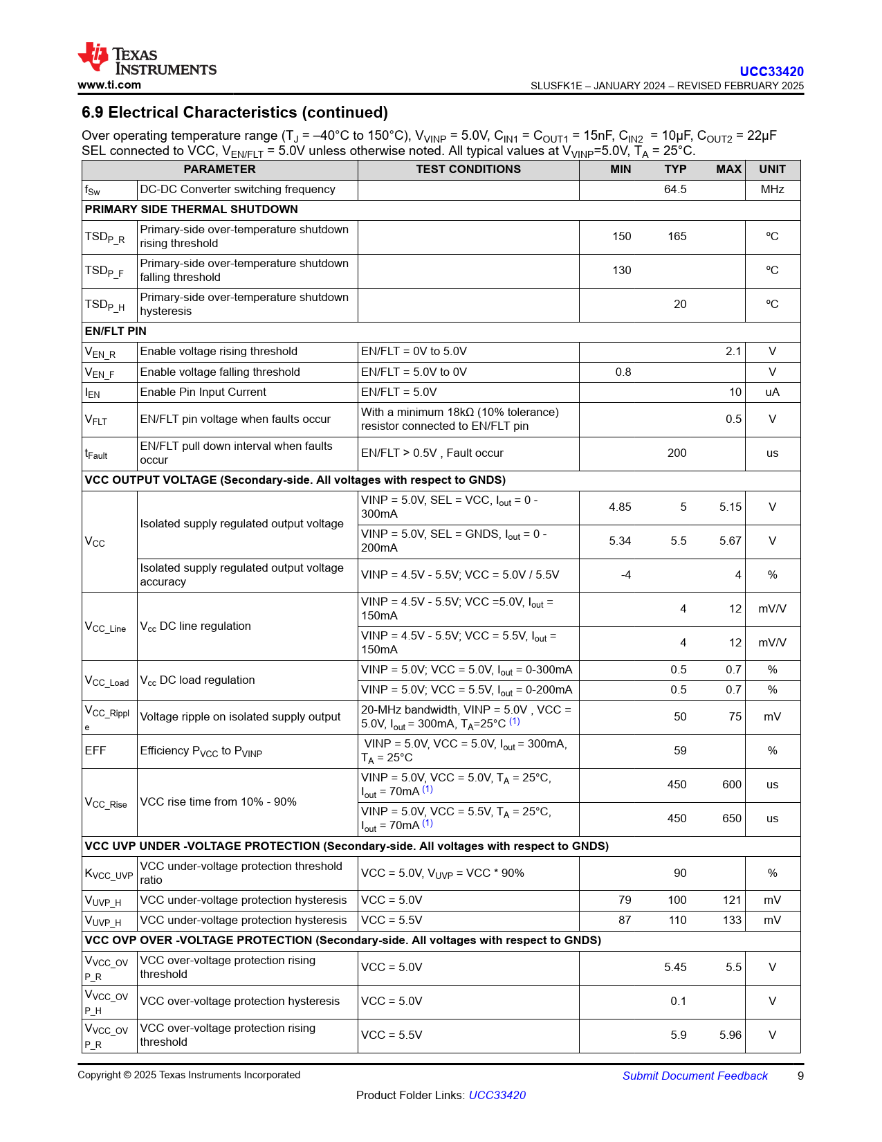 VVCC_OV VCC over-voltage protection rising VCC = 5.0V 5.45 5.5 V P_R threshold VVCC_OV VCC over-voltage protection hysteresis VCC = 5.0V 0.1 V P_H VVCC_OV VCC over-voltage protection rising VCC = 5.5V 5.9 5.96 V P_R threshold Copyright © 2025 Texas Instruments Incorporated Submit Document Feedback 9 Product Folder Links: UCC33420 Document Outline 1 Features 2 Applications 3 Description Table of Contents 4 Device Comparison 5 Pin Configuration and Functions 6 Specifications 6.1 Absolute Maximum Ratings 6.2 ESD Ratings 6.3 Recommended Operating Conditions 6.4 Thermal Information 6.5 Power Ratings 6.6 Insulation Specifications 6.7 Safety-Related Certifications 6.8 Safety Limiting Values 6.9 Electrical Characteristics 6.10 Typical Characteristics 7 Detailed Description 7.1 Overview 7.2 Functional Block Diagram 7.3 Feature Description 7.3.1 Enable and Disable 7.3.2 Output Voltage Soft-Start 7.3.3 Output Voltage Steady-State Regulation 7.3.4 Protection Features 7.3.4.1 Input Under-Voltage and Over-Voltage Lockout 7.3.4.2 Output Under-Voltage Protection 7.3.4.3 Output Over-Voltage Protection 7.3.4.4 Over-Temperature Protection 7.3.4.5 Fault Reporting and Auto-Restart 7.3.5 VCC Load Recommended Operating Area 7.3.6 Electromagnetic Compatibility (EMC) Considerations 7.4 Device Functional Modes 8 Application and Implementation 8.1 Application Information 8.2 Typical Application 8.2.1 Design Requirements 8.2.2 Detailed Design Procedure 8.3 Power Supply Recommendations 8.4 Layout 8.4.1 Layout Guidelines 8.4.2 Layout Example 9 Device and Documentation Support 9.1 Device Support 9.1.1 Third-Party Products Disclaimer 9.2 Documentation Support 9.2.1 Related Documentation 9.3 Receiving Notification of Documentation Updates 9.4 Support Resources 9.5 Trademarks 9.6 Electrostatic Discharge Caution 9.7 Glossary 10 Revision History 11 Mechanical and Packaging Information