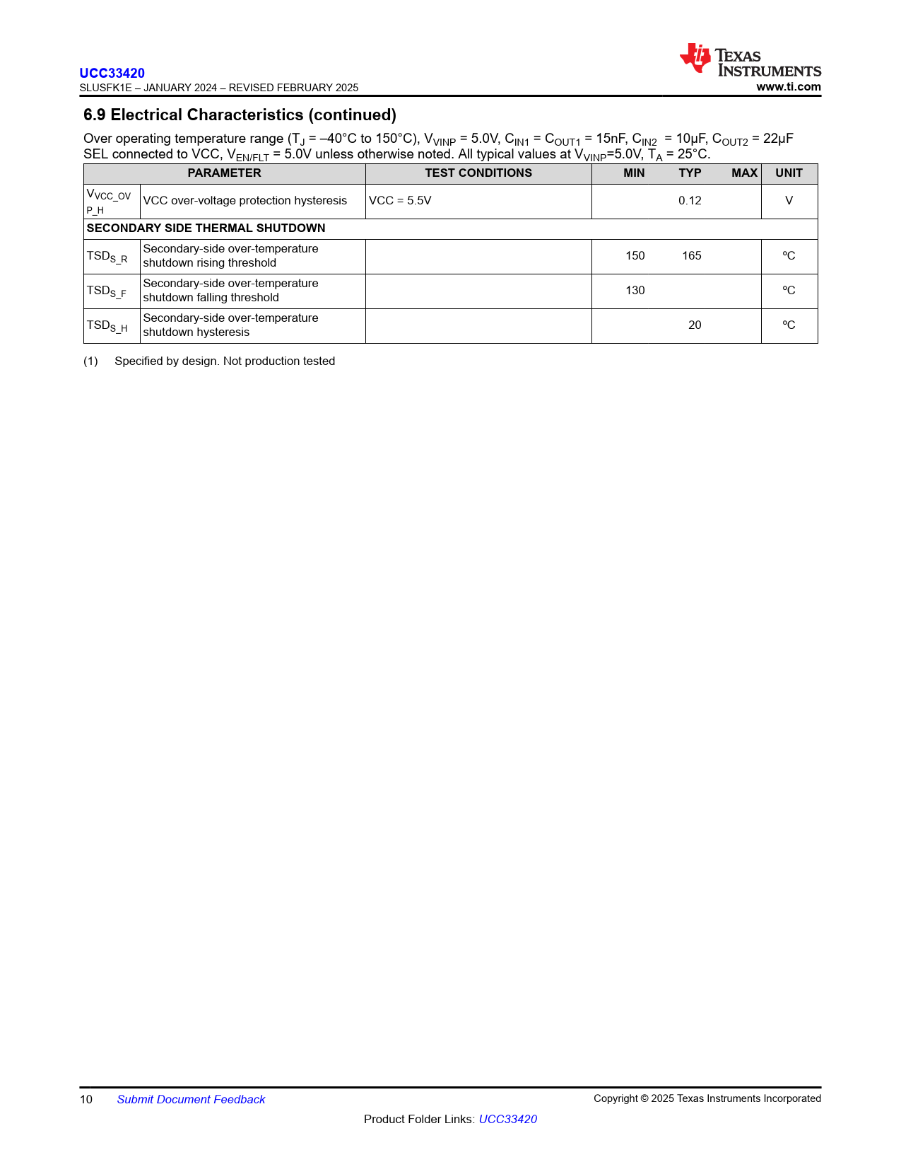 Secondary-side over-temperature TSDS_R 150 165 ºC shutdown rising threshold Secondary-side over-temperature TSDS_F 130 ºC shutdown falling threshold Secondary-side over-temperature TSDS_H 20 ºC shutdown hysteresis (1) Specified by design. Not production tested 10 Submit Document Feedback Copyright © 2025 Texas Instruments Incorporated Product Folder Links: UCC33420 Document Outline 1 Features 2 Applications 3 Description Table of Contents 4 Device Comparison 5 Pin Configuration and Functions 6 Specifications 6.1 Absolute Maximum Ratings 6.2 ESD Ratings 6.3 Recommended Operating Conditions 6.4 Thermal Information 6.5 Power Ratings 6.6 Insulation Specifications 6.7 Safety-Related Certifications 6.8 Safety Limiting Values 6.9 Electrical Characteristics 6.10 Typical Characteristics 7 Detailed Description 7.1 Overview 7.2 Functional Block Diagram 7.3 Feature Description 7.3.1 Enable and Disable 7.3.2 Output Voltage Soft-Start 7.3.3 Output Voltage Steady-State Regulation 7.3.4 Protection Features 7.3.4.1 Input Under-Voltage and Over-Voltage Lockout 7.3.4.2 Output Under-Voltage Protection 7.3.4.3 Output Over-Voltage Protection 7.3.4.4 Over-Temperature Protection 7.3.4.5 Fault Reporting and Auto-Restart 7.3.5 VCC Load Recommended Operating Area 7.3.6 Electromagnetic Compatibility (EMC) Considerations 7.4 Device Functional Modes 8 Application and Implementation 8.1 Application Information 8.2 Typical Application 8.2.1 Design Requirements 8.2.2 Detailed Design Procedure 8.3 Power Supply Recommendations 8.4 Layout 8.4.1 Layout Guidelines 8.4.2 Layout Example 9 Device and Documentation Support 9.1 Device Support 9.1.1 Third-Party Products Disclaimer 9.2 Documentation Support 9.2.1 Related Documentation 9.3 Receiving Notification of Documentation Updates 9.4 Support Resources 9.5 Trademarks 9.6 Electrostatic Discharge Caution 9.7 Glossary 10 Revision History 11 Mechanical and Packaging Information