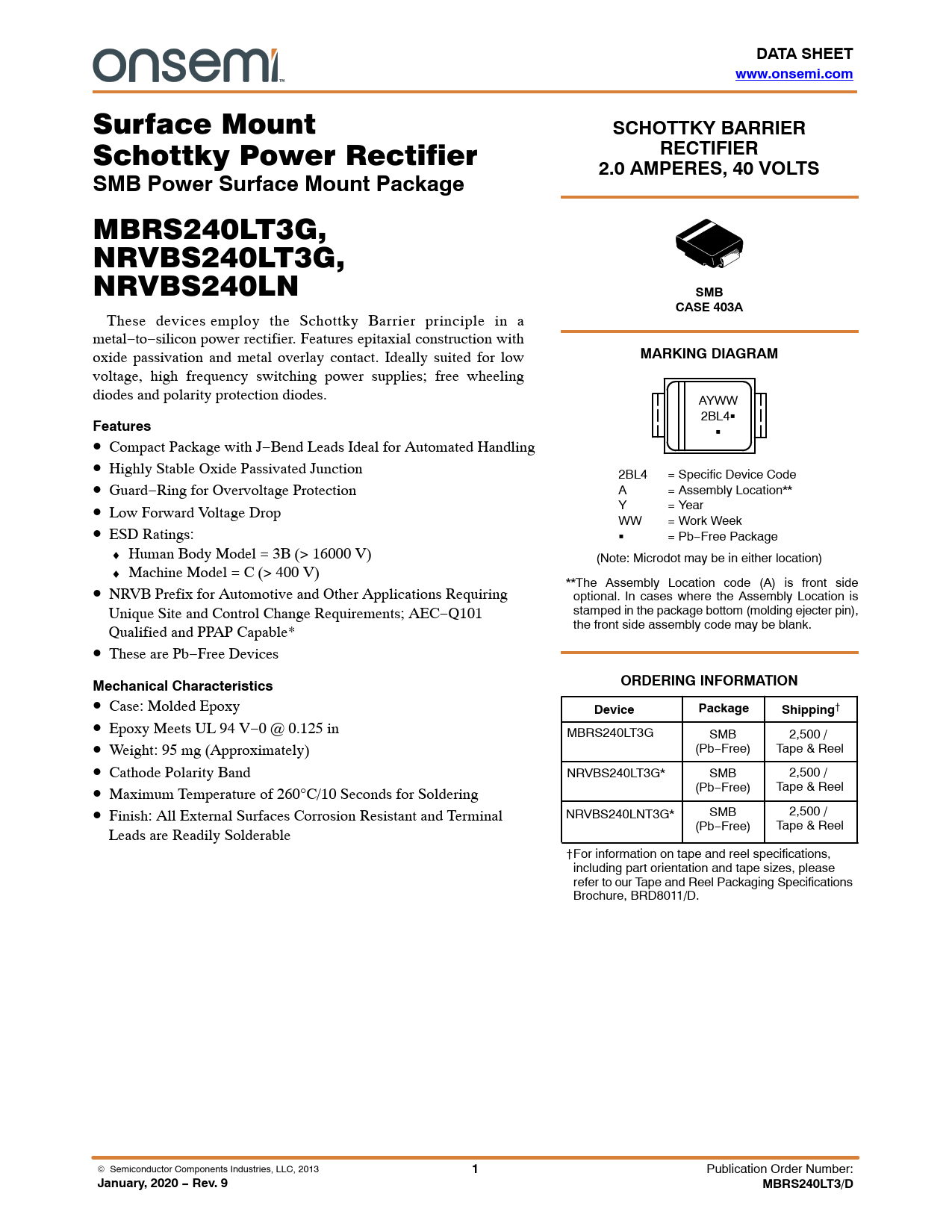 DATA SHEET. www.onsemi.com. SCHOTTKY BARRIER. RECTIFIER. 2.0 AMPERES, 40 VOLTS. SMB Power Surface Mount Package. SMB. CASE 403A