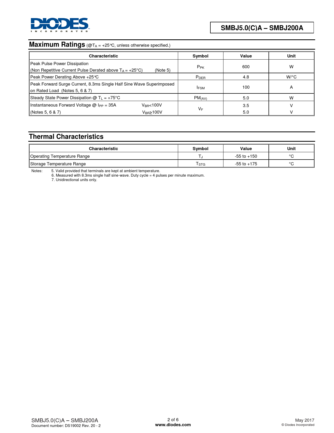 SMBJ5.0(C)A – SMBJ200A. Maximum Ratings. Characteristic. Symbol. Value. Unit. Thermal Characteristics. www.diodes.com