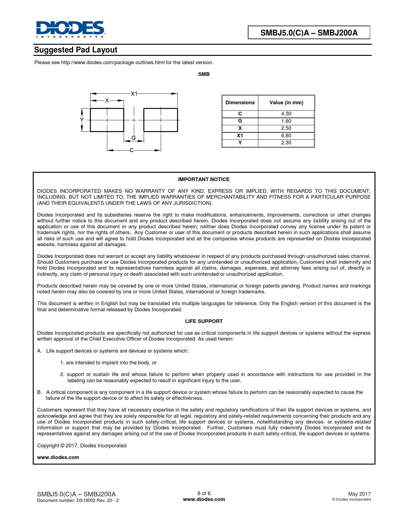 SMBJ5.0(C)A – SMBJ200A. Suggested Pad Layout. SMB. Dimensions. Value (in mm). IMPORTANT NOTICE. LIFE SUPPORT. www.diodes.com