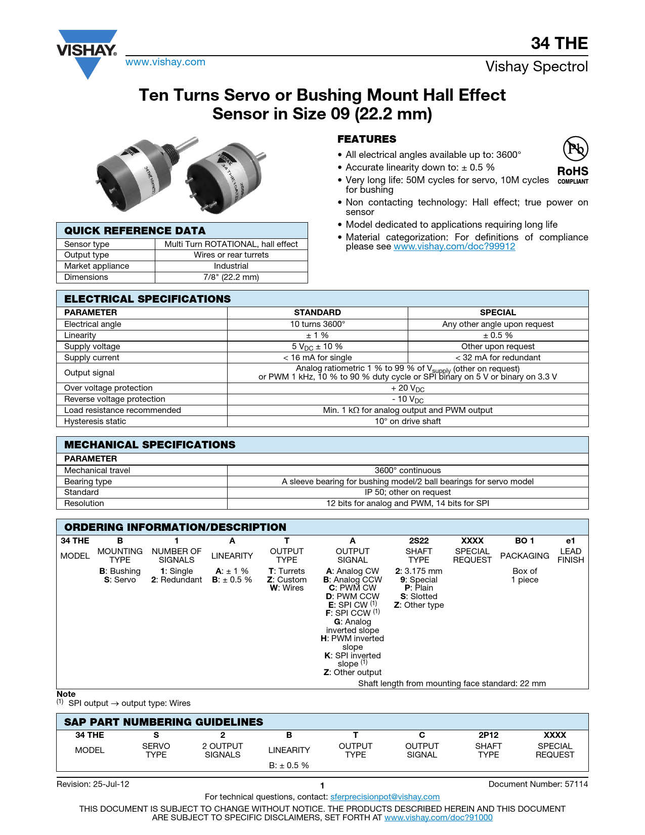 34 THE www.vishay.com Vishay Spectrol Ten Turns Servo or Bushing Mount Hall EffectSensor in Size 09 (22.2 mm)FEATURES • All electrical angles available up to: 3600° • Accurate linearity down to: ± 0.5 % • Very long life: 50M cycles for servo, 10M cycles for bushing • Non contacting technology: Hall effect; true power on sensor • Model dedicated to applications requiring long life QUICK REFERENCE DATA • Material categorization: For definitions of compliance Sensor type Multi Turn ROTATIONAL, hall effect please see www.vishay.com/doc?99912 Output type Wires or rear turrets Market appliance Industrial Dimensions 7/8" (22.2 mm) ELECTRICAL SPECIFICATIONSPARAMETERSTANDARDSPECIAL Electrical angle 10 turns 3600° Any other angle upon request Linearity ± 1 % ± 0.5 % Supply voltage 5 VDC ± 10 % Other upon request Supply current < 16 mA for single < 32 mA for redundant Analog ratiometric 1 % to 99 % of V Output signal supply (other on request) or PWM 1 kHz, 10 % to 90 % duty cycle or SPI binary on 5 V or binary on 3.3 V Over voltage protection + 20 VDC Reverse voltage protection - 10 VDC Load resistance recommended Min. 1 k for analog output and PWM output Hysteresis static 10° on drive shaft MECHANICAL SPECIFICATIONSPARAMETER Mechanical travel 3600° continuous Bearing type A sleeve bearing for bushing model/2 ball bearings for servo model Standard IP 50; other on request Resolution 12 bits for analog and PWM, 14 bits for SPI ORDERING INFORMATION/DESCRIPTION34 THEB1ATA2S22XXXXBO 1e1 MOUNTING NUMBER OF OUTPUT OUTPUT SHAFT SPECIAL LEAD MODEL LINEARITY PACKAGING TYPE SIGNALS TYPE SIGNAL TYPE REQUEST FINISH B : Bushing 1 : Single A : ± 1 % T : Turrets A : Analog CW 2 : 3.175 mm Box of S : Servo 2 : Redundant B : ± 0.5 % Z : Custom B : Analog CCW 9 : Special 1 piece W : Wires C : PWM CW P : Plain D : PWM CCW S : Slotted E : SPI CW (1) Z : Other type F : SPI CCW (1) G : Analog inverted slope H : PWM inverted slope K : SPI inverted slope (1) Z : Other output Shaft length from mounting face standard: 22 mm Note (1) SPI output output type: Wires SAP PART NUMBERING GUIDELINES34 THES2BTC2P12XXXX SERVO 2 OUTPUT OUTPUT OUTPUT SHAFT SPECIAL MODEL LINEARITY TYPE SIGNALS TYPE SIGNAL TYPE REQUEST B: ± 0.5 % Revision: 25-Jul-12 1 Document Number: 57114 For technical questions, contact: sferprecisionpot@vishay.com THIS DOCUMENT IS SUBJECT TO CHANGE WITHOUT NOTICE. THE PRODUCTS DESCRIBED HEREIN AND THIS DOCUMENT ARE SUBJECT TO SPECIFIC DISCLAIMERS, SET FORTH AT www.vishay.com/doc?91000