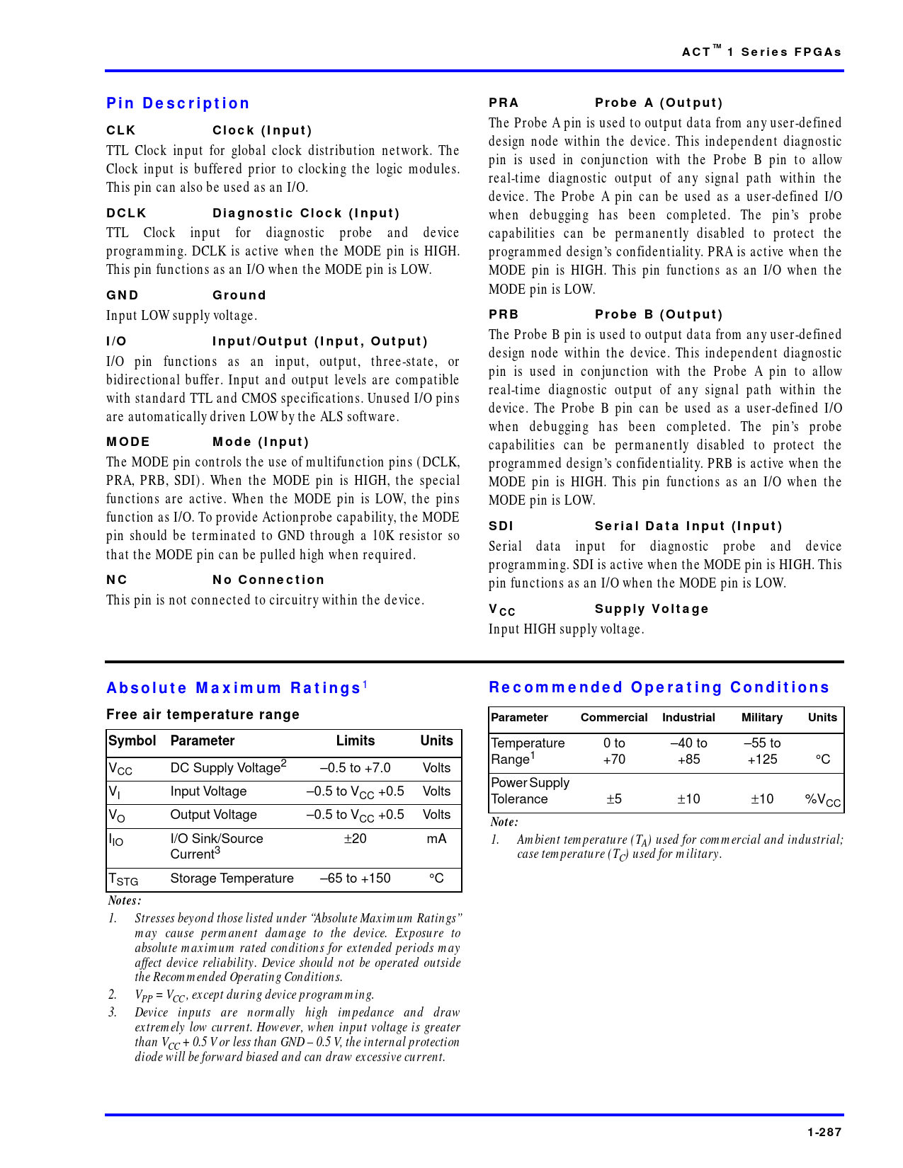 A C T ™ 1 S e r i e s F P G A sP i n D e s c r i p t i o nPRAProbe A (Output) The Probe A pin is used to output data from any user-defined CLKClock (Input) design node within the device. This independent diagnostic TTL Clock input for global clock distribution network. The pin is used in conjunction with the Probe B pin to allow Clock input is buffered prior to clocking the logic modules. real-time diagnostic output of any signal path within the This pin can also be used as an I/O. device. The Probe A pin can be used as a user-defined I/O DCLKDiagnostic Clock (Input) when debugging has been completed. The pin’s probe TTL Clock input for diagnostic probe and device capabilities can be permanently disabled to protect the programming. DCLK is active when the MODE pin is HIGH. programmed design’s confidentiality. PRA is active when the This pin functions as an I/O when the MODE pin is LOW. MODE pin is HIGH. This pin functions as an I/O when the MODE pin is LOW. GNDGround Input LOW supply voltage. PRBProbe B (Output) The Probe B pin is used to output data from any user-defined I/OInput/Output (Input, Output) design node within the device. This independent diagnostic I/O pin functions as an input, output, three-state, or pin is used in conjunction with the Probe A pin to allow bidirectional buffer. Input and output levels are compatible real-time diagnostic output of any signal path within the with standard TTL and CMOS specifications. Unused I/O pins device. The Probe B pin can be used as a user-defined I/O are automatically driven LOW by the ALS software. when debugging has been completed. The pin’s probe MODEMode (Input) capabilities can be permanently disabled to protect the The MODE pin controls the use of multifunction pins (DCLK, programmed design’s confidentiality. PRB is active when the PRA, PRB, SDI). When the MODE pin is HIGH, the special MODE pin is HIGH. This pin functions as an I/O when the functions are active. When the MODE pin is LOW, the pins MODE pin is LOW. function as I/O. To provide Actionprobe capability, the MODE SDISerial Data Input (Input) pin should be terminated to GND through a 10K resistor so Serial data input for diagnostic probe and device that the MODE pin can be pulled high when required. programming. SDI is active when the MODE pin is HIGH. This NCNo Connection pin functions as an I/O when the MODE pin is LOW. This pin is not connected to circuitry within the device. VCCSupply Voltage Input HIGH supply voltage. A b s o l u t e M a x i m u m R a t i n g s 1 R e c o m m e n d e d O p e r a t i n g C o n d i t i o n sFree air temperature rangeParameterCommercialIndustrialMilitaryUnitsSymbolParameterLimitsUnits Temperature 0 to –40 to –55 to Range1 +70 +85 +125 °C V 2 CC DC Supply Voltage –0.5 to +7.0 Volts Power Supply VI Input Voltage –0.5 to VCC +0.5 Volts Tolerance ±5 ±10 ±10 %VCC VO Output Voltage –0.5 to VCC +0.5 Volts Note: I ± IO I/O Sink/Source 20 mA 1. Ambient temperature (TA) used for commercial and industrial; Current3 case temperature (TC) used for military. T ° STG Storage Temperature –65 to +150 C Notes: 1. Stresses beyond those listed under “Absolute Maximum Ratings” may cause permanent damage to the device. Exposure to absolute maximum rated conditions for extended periods may affect device reliability. Device should not be operated outside the Recommended Operating Conditions. 2. VPP = VCC , except during device programming. 3. Device inputs are normally high impedance and draw extremely low current. However, when input voltage is greater than VCC + 0.5 V or less than GND – 0.5 V, the internal protection diode will be forward biased and can draw excessive current. 1-287 Document Outline ACT™ 1 Series FPGAs Features Description Product Family Profile The Designer and Designer Advantage™ Systems ACT 1 Device Structure The ACT 1 Logic Module I/O Buffers Device Organization Probe Pin ACT 1 Array Performance Temperature and Voltage Effects Logic Module Size Ordering Information Product Plan Device Resources Pin Description Absolute Maximum Ratings1 Free air temperature range Recommended Operating Conditions Electrical Specifications (5V) Electrical Specifications (3.3V) Package Thermal Characteristics General Power Equation Static Power Component Active Power Component Equivalent Capacitance CEQ Values for Actel FPGAs Fixed Capacitance Values for Actel FPGAs (pF) Determining Average Switching Frequency Functional Timing Tests Output Buffer Performance Derating (5V) Output Buffer Performance Derating (3.3V) ACT 1 Timing Module* Predictable Performance: Tight Delay Distributions... Timing Characteristics Critical Nets and Typical Nets Long Tracks Timing Derating Timing Derating Factor (Temperature and Voltage) Timing Derating Factor for Designs at Typical Temp... Temperature and Voltage Derating Factors (normaliz... Temperature and Voltage Derating Factors (normaliz... Junction Temperature and Voltage Derating Curves (... Parameter Measurement Output Buffer Delays AC Test Loads Input Buffer Delays Module Delays Sequential Timing Characteristics Flip-Flops and Latches ACT 1 Timing Characteristics (Worst-Case Commercial Conditions, VCC = 4.75 V,T... ACT 1 Timing Characteristics (continued) (Worst-Case Commercial Conditions) ACT 1 Timing Characteristics (continued) (Worst-Case Commercial Conditions) Package Pin Assignments 44-Pin PLCC 68-Pin PLCC Package Pin Assignments (continued) 84-Pin PLCC Package Pin Assignments (continued) 100-Pin PQFP Package Pin Assignments (continued) 80-Pin VQFP Package Pin Assignments (continued) 84-Pin CPGA Package Pin Assignments (continued) 84-Pin CQFP