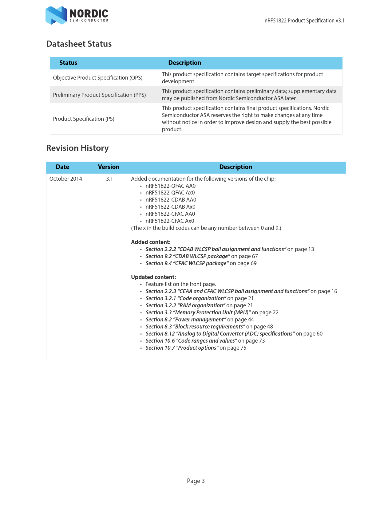 This product specification contains target specifications for product Objective Product Specification (OPS) development. This product specification contains preliminary data; supplementary data Preliminary Product Specification (PPS) may be published from Nordic Semiconductor ASA later. This product specification contains final product specifications. Nordic Semiconductor ASA reserves the right to make changes at any time Product Specification (PS) without notice in order to improve design and supply the best possible product.