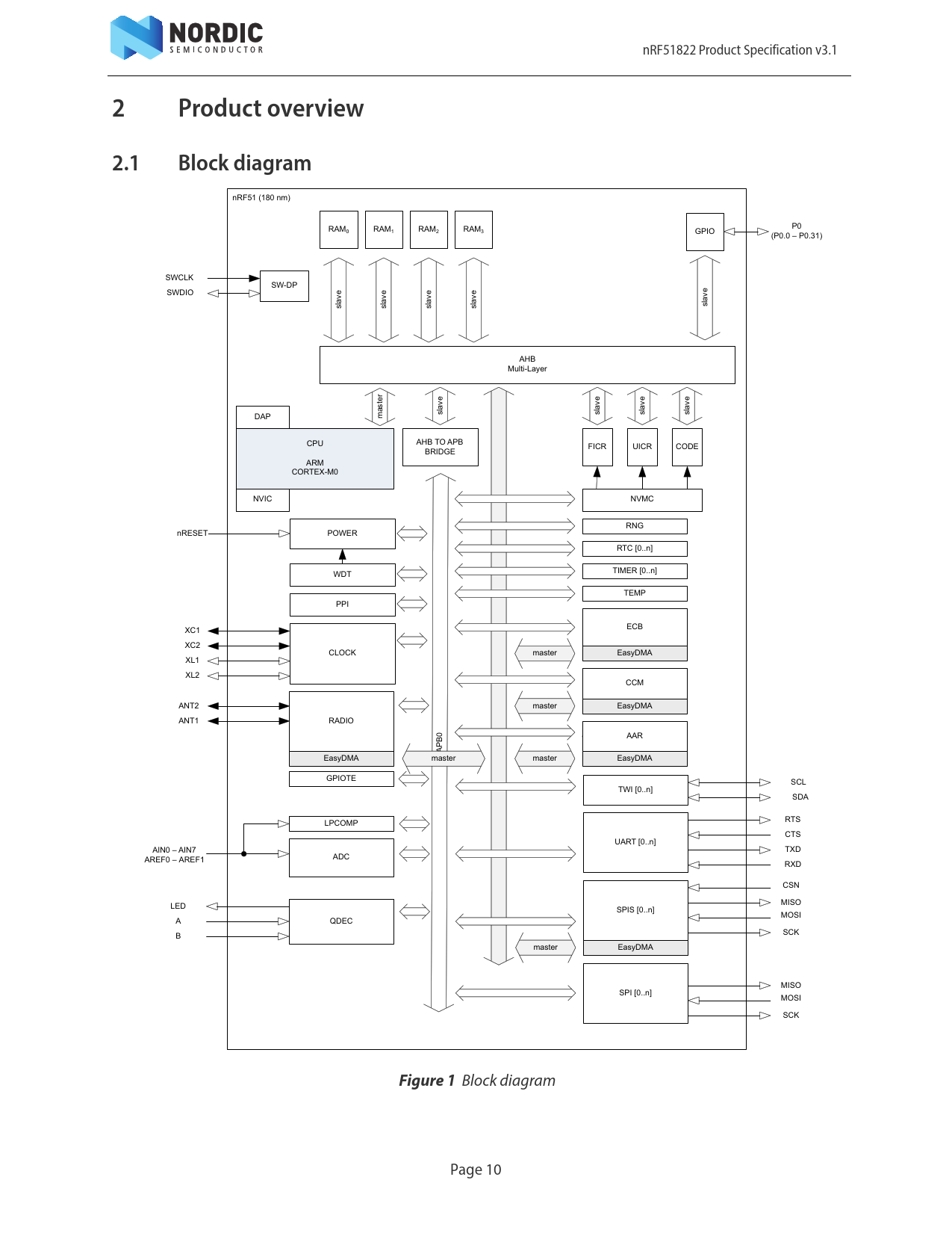 Block diagram Page 10 Document Outline 1 Introduction 1.1 Required reading 1.2 Writing conventions 2 Product overview 2.1 Block diagram 2.2 Pin assignments and functions 2.2.1 Pin assignment QFN48 2.2.2 CDAB WLCSP ball assignment and functions 2.2.3 CEAA and CFAC WLCSP ball assignment and functions 3 System blocks 3.1 CPU 3.2 Memory 3.2.1 Code organization 3.2.2 RAM organization 3.3 Memory Protection Unit (MPU) 3.4 Power management (POWER) 3.4.1 Power supply 3.4.2 Power management 3.5 Programmable Peripheral Interconnect (PPI) 3.6 Clock management (CLOCK) 3.6.1 16/32 MHz crystal oscillator 3.6.2 32.768 kHz crystal oscillator 3.6.3 32.768 kHz RC oscillator 3.6.4 Synthesized 32.768 kHz clock 3.7 GPIO 3.8 Debugger support 4 Peripheral blocks 4.1 2.4 GHz radio (RADIO) 4.2 Timer/counters (TIMER) 4.3 Real Time Counter (RTC) 4.4 AES Electronic Codebook Mode Encryption (ECB) 4.5 AES CCM Mode Encryption (CCM) 4.6 Accelerated Address Resolver (AAR) 4.7 Random Number Generator (RNG) 4.8 Watchdog Timer (WDT) 4.9 Temperature sensor (TEMP) 4.10 Serial Peripheral Interface (SPI/SPIS) 4.11 Two-wire interface (TWI) 4.12 Universal Asynchronous Receiver/Transmitter (UART) 4.13 Quadrature Decoder (QDEC) 4.14 Analog to Digital Converter (ADC) 4.15 GPIO Task Event blocks (GPIOTE) 4.16 Low Power Comparator (LPCOMP) 5 Instance table 6 Absolute maximum ratings 7 Operating conditions 7.1 WLCSP light sensitivity 8 Electrical specifications 8.1 Clock sources 8.1.1 16/32 MHz crystal startup 8.1.2 16 MHz crystal oscillator (16M XOSC) 8.1.3 32 MHz crystal oscillator (32M XOSC) 8.1.4 16 MHz RC oscillator (16M RCOSC) 8.1.5 32.768 kHz crystal oscillator (32k XOSC) 8.1.6 32.768 kHz RC oscillator (32k RCOSC) 8.1.7 32.768 kHz Synthesized oscillator (32k SYNT) 8.2 Power management 8.3 Block resource requirements 8.4 CPU 8.5 Radio transceiver 8.5.1 General radio characteristics 8.5.2 Radio current consumption with DC/DC disabled 8.5.3 Radio current consumption with DC/DC enabled 8.5.4 Transmitter specifications 8.5.5 Receiver specifications 8.5.6 Radio timing parameters 8.5.7 Antenna matching network requirements 8.6 Received Signal Strength Indicator (RSSI) specifications 8.7 Universal Asynchronous Receiver/Transmitter (UART) specifications 8.8 Serial Peripheral Interface Slave (SPIS) specifications 8.9 Serial Peripheral Interface (SPI) Master specifications 8.10 I2C compatible Two Wire Interface (TWI) specifications 8.11 GPIO Tasks and Events (GPIOTE) specifications 8.12 Analog to Digital Converter (ADC) specifications 8.13 Timer (TIMER) specifications 8.14 Real Time Counter (RTC) 8.15 Temperature sensor (TEMP) 8.16 Random Number Generator (RNG) specifications 8.17 AES Electronic Codebook Mode Encryption (ECB) specifications 8.18 AES CCM Mode Encryption (CCM) specifications 8.19 Accelerated Address Resolver (AAR) specifications 8.20 Watchdog Timer (WDT) specifications 8.21 Quadrature Decoder (QDEC) specifications 8.22 Non-Volatile Memory Controller (NVMC) specifications 8.23 General Purpose I/O (GPIO) specifications 8.24 Low Power Comparator (LPCOMP) specifications 9 Mechanical specifications 9.1 QFN48 package 9.2 CDAB WLCSP package 9.3 CEAA WLCSP package 9.4 CFAC WLCSP package 10 Ordering information 10.1 Chip marking 10.2 Inner box label 10.3 Outer box label 10.4 Order code 10.5 Abbreviations 10.6 Code ranges and values 10.7 Product options 10.7.1 nRF ICs 10.7.2 Development tools 11 Reference circuitry 11.1 PCB guidelines 11.1.1 PCB layout example 11.2 Reference design schematics 11.3 QFAA QFN48 package 11.3.1 QFAA QFN48 schematic with internal LDO setup 11.3.2 QFAA QFN48 schematic with low voltage mode setup 11.3.3 QFAA QFN48 schematic with DC/DC converter setup 11.4 QFAB QFN48 package 11.4.1 QFAB QFN48 schematic with internal LDO setup 11.4.2 QFAB QFN48 schematic with low voltage mode setup 11.4.3 QFAB QFN48 schematic with DC/DC converter setup 11.5 QFAC QFN48 package 11.5.1 QFAC QFN48 schematic with internal LDO setup 11.5.2 QFAC QFN48 schematic with low voltage mode setup 11.5.3 QFAC QFN48 schematic with DC/DC converter setup 11.6 CDAB WLCSP package 11.6.1 CDAB WLCSP schematic with internal LDO setup 11.6.2 CDAB WLCSP schematic with low voltage mode setup 11.6.3 CDAB WLCSP schematic with DC/DC converter setup 11.7 CEAA WLCSP package 11.7.1 CEAA WLCSP schematic with internal LDO setup 11.7.2 CEAA WLCSP schematic with low voltage mode setup 11.7.3 CEAA WLCSP schematic with DC/DC converter setup 11.8 CFAC WLCSP package 11.8.1 CFAC WLCSP schematic with internal LDO setup 11.8.2 CFAC WLCSP schematic with low voltage mode setup 11.8.3 CFAC WLCSP schematic with DC/DC converter setup 12 Glossary