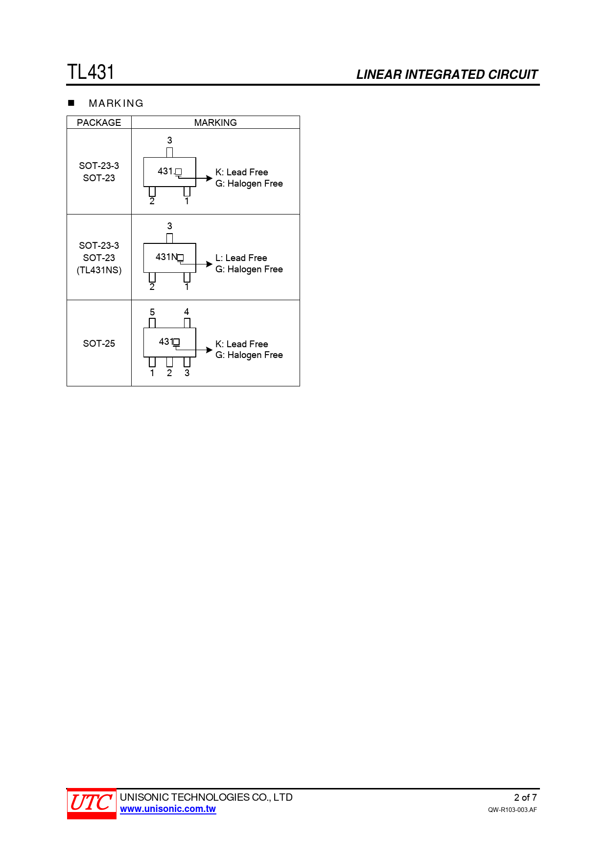 MARKING PACKAGE MARKING 3 SOT-23-3 431. K: Lead Free SOT-23 G: Halogen Free 2 1 3 SOT-23-3 SOT-23 431N L: Lead Free (TL431NS) G: Halogen Free 2 1 5 4 SOT-25 431 K: Lead Free G: Halogen Free 1 2 3 UNISONIC TECHNOLOGIES CO., LTD 2 of 7