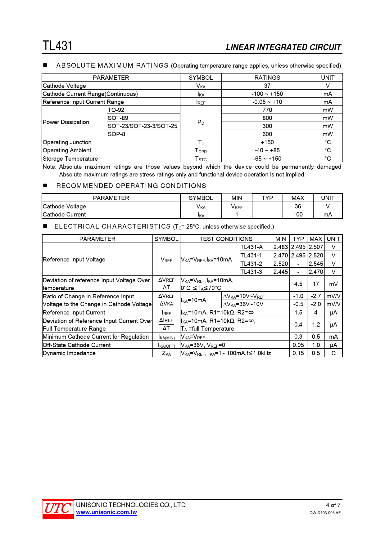 Pages / Page7 / 4 — TL431. LINEAR INTEGRATED CIRCUIT. www.unisonic.com.tw