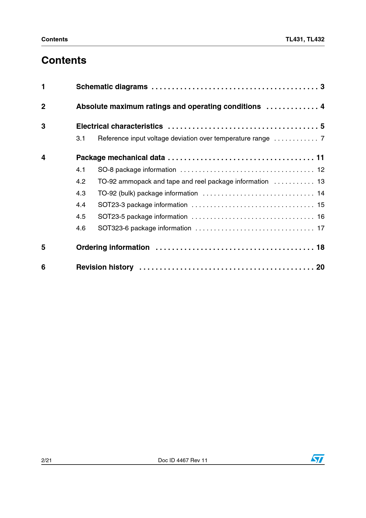 Contents TL431, TL432 Contents 1 Schematic diagrams . 3 2 Absolute maximum ratings and operating conditions . 4 3 Electrical characteristics . 5