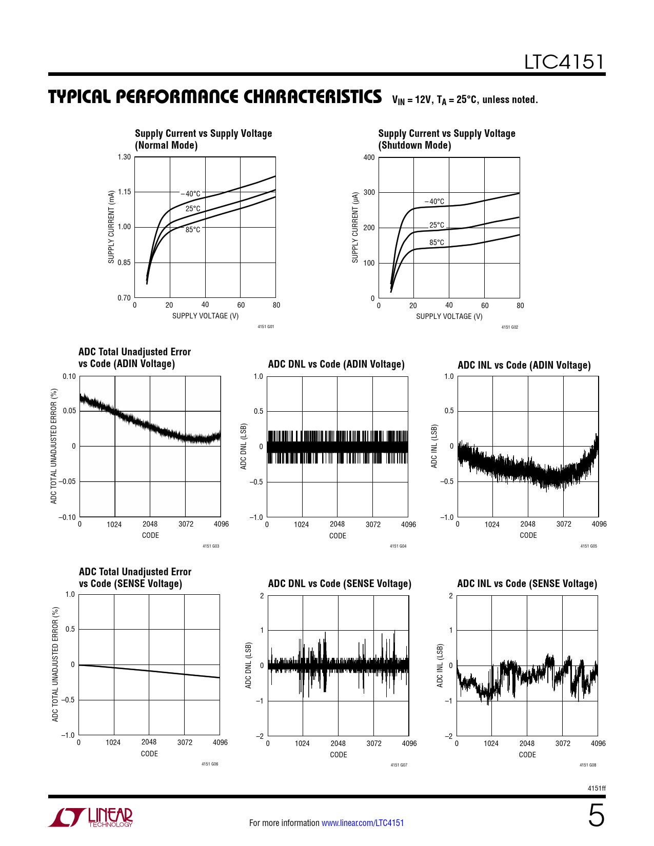 0.10 1.0 1.0 0.05 0.5 0.5 0 0 0 ADC DNL (LSB) ADC INL (LSB) –0.05 –0.5 –0.5 ADC TOTAL UNADJUSTED ERROR (%) –0.10 –1.0 –1.0 0 1024 2048 3072 4096 0 1024 2048 3072 4096 0 1024 2048 3072 4096 CODE CODE CODE 4151 G03 4151 G04 4151 G05