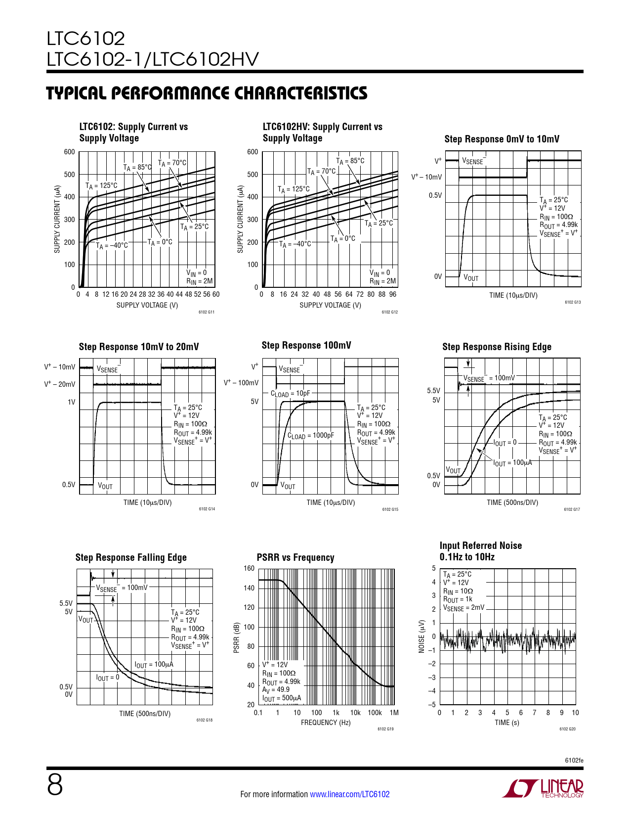 LTC6102 LTC6102-1/LTC6102HV Typical perForMance characTerisTicsLTC6102: Supply Current vsLTC6102HV: Supply Current vsSupply VoltageSupply VoltageStep Response 0mV to 10mV 600 600 T – A = 85°C V+ VSENSE TA = 85°C TA = 70°C 500 500 TA = 70°C V+ – 10mV A) TA = 125°C A) T μ A = 125°C 400 μ 400 0.5V TA = 25°C V+ = 12V 300 300 RIN = 100Ω T TA = 25°C ROUT = 4.99k Y CURRENT ( A = 25°C Y CURRENT ( V + SENSE = V+ 200 TA = 0°C T 200 TA = –40°C SUPPL A = –40°C TA = 0°C SUPPL 100 100 VIN = 0 VIN = 0 R 0V VOUT IN = 2M RIN = 2M 0 0 0 4 8 12 16 20 24 28 32 36 40 44 48 52 56 60 0 8 16 24 32 40 48 56 64 72 80 88 96 TIME (10μs/DIV) SUPPLY VOLTAGE (V) SUPPLY VOLTAGE (V) 6102 G13 6102 G11 6102 G12 Step Response 10mV to 20mVStep Response 100mVStep Response Rising Edge V+ – 10mV V – – SENSE V+ VSENSE V – = 100mV V+ – 20mV V+ – 100mV SENSE C 5.5V LOAD = 10pF 1V 5V 5V TA = 25°C TA = 25°C V+ = 12V V+ = 12V TA = 25°C RIN = 100Ω RIN = 100Ω V+ = 12V ROUT = 4.99k C ROUT = 4.99k RIN = 100Ω V + LOAD = 1000pF + SENSE = V+ VSENSE = V+ IOUT = 0 ROUT = 4.99k V + SENSE = V+ IOUT = 100μA V 0.5V OUT 0.5V VOUT 0V VOUT 0V TIME (10μs/DIV) TIME (10μs/DIV) TIME (500ns/DIV) 6102 G14 6102 G15 6102 G17 Input Referred NoiseStep Response Falling EdgePSRR vs Frequency0.1Hz to 10Hz 160 5 TA = 25°C 4 V+ = 12V V – SENSE = 100mV 140 RIN = 10Ω 3 5.5V ROUT = 1k 120 V 5V T 2 SENSE = 2mV A = 25°C VOUT V+ = 12V V) 1 RIN = 100Ω 100 μ ROUT = 4.99k 0 V + SENSE = V+ PSRR (dB) 80 NOISE ( –1 IOUT = 100μA 60 V+ = 12V –2 I RIN = 100Ω OUT = 0 R –3 0.5V 40 OUT = 4.99k A 0V V = 49.9 –4 IOUT = 500μA 20 –5 TIME (500ns/DIV) 0.1 1 10 100 1k 10k 100k 1M 0 1 2 3 4 5 6 7 8 9 10 6102 G18 FREQUENCY (Hz) TIME (s) 6102 G19 6102 G20 6102fe 8 For more information www.linear.com/LTC6102