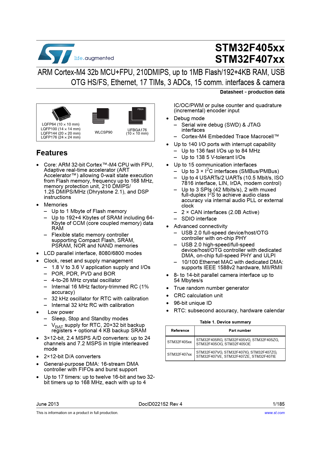 | Pages / Page | 185 / 1 — STM32F405xx. STM32F407xx. Datasheet. production data. Features. Table 1. … |