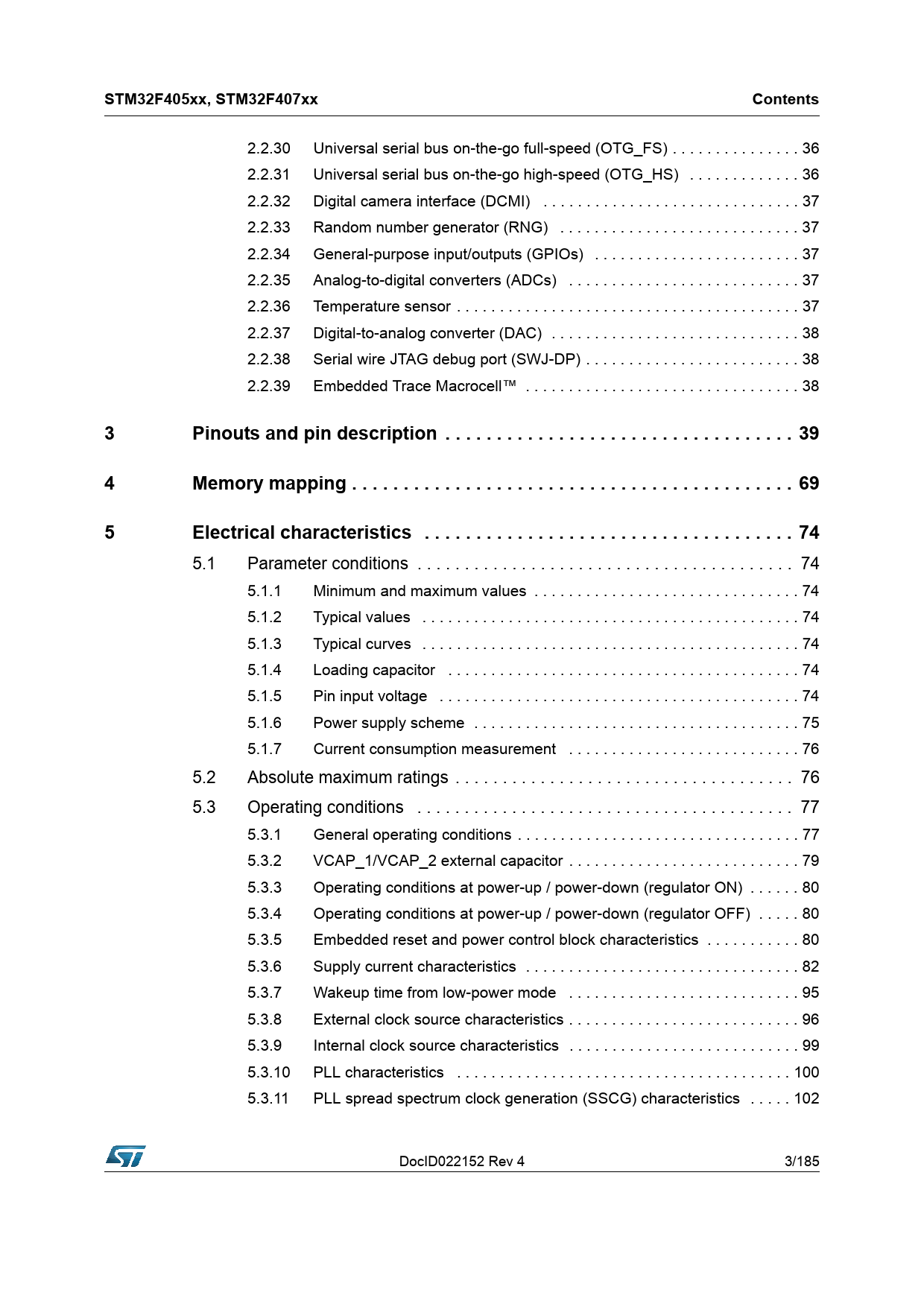 | Pages / Page | 185 / 3 — STM32F405xx, STM32F407xx. Contents. Pinouts and pin description . 39. … |