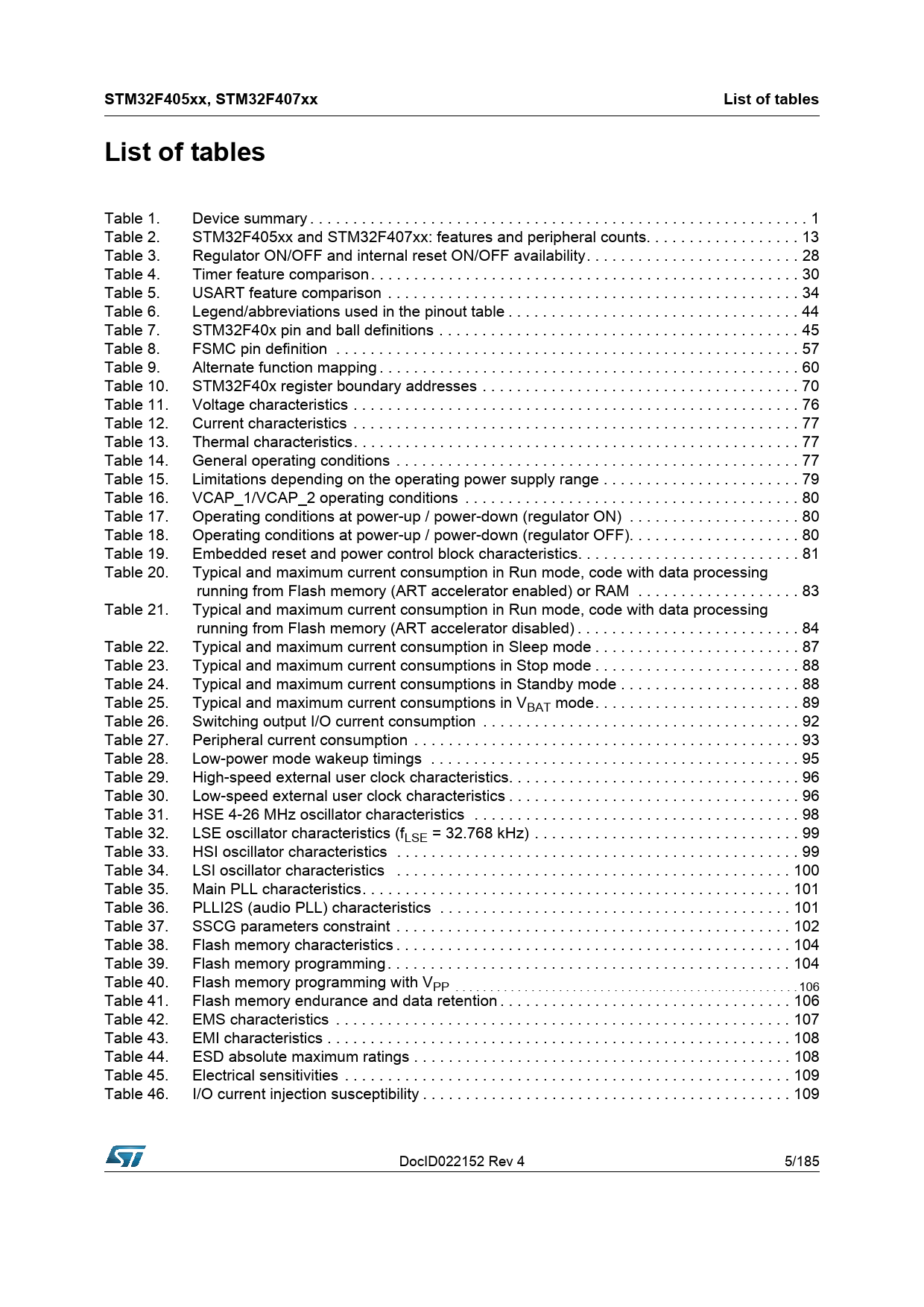 | Pages / Page | 185 / 5 — STM32F405xx, STM32F407xx. List of tables |
