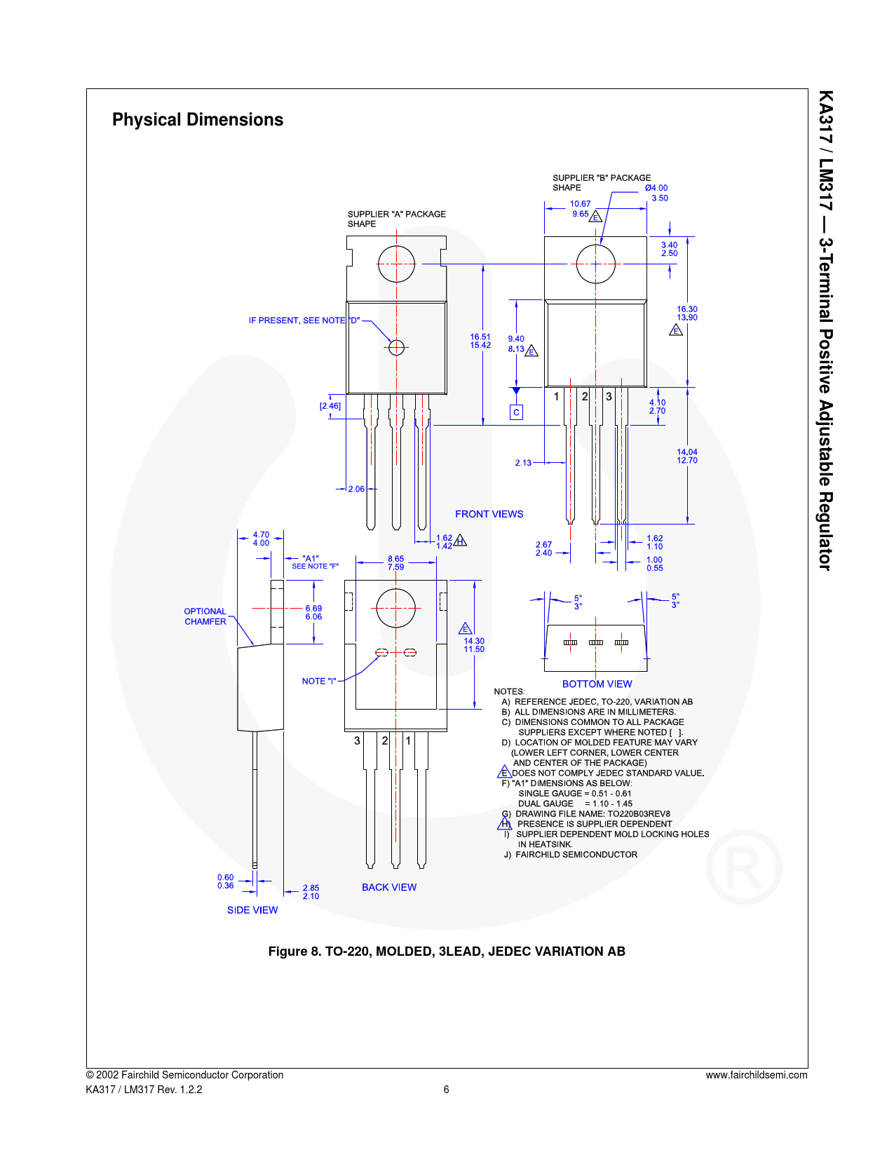 KA317 / LM317 — 3-Terminal Positive Adjustable Regulator Physical Dimensions Figure 8. TO-220, MOLDED, 3LEAD, JEDEC VARIATION AB © 2002 Fairchild Semiconductor Corporation