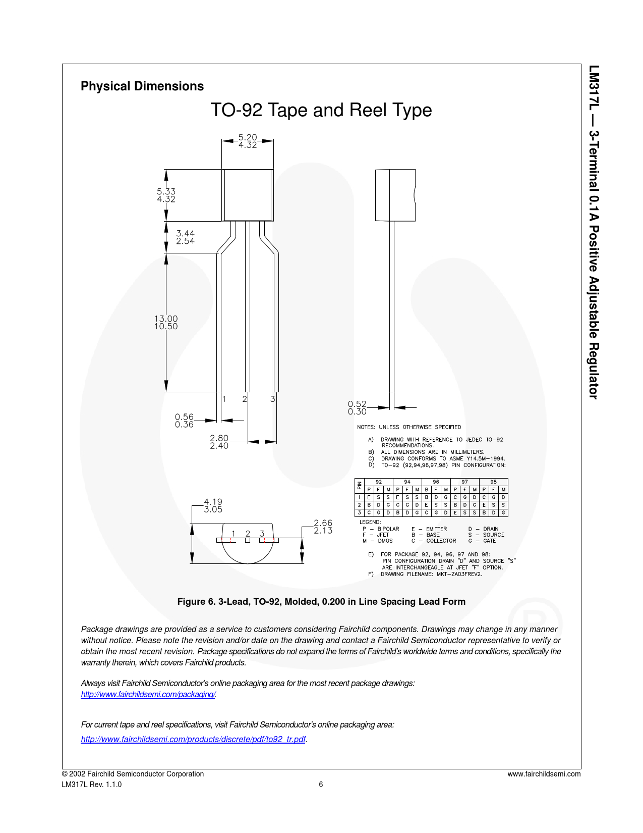 Package drawings are provided as a service to customers considering Fairchild components. Drawings may change in any manner without notice. Please note the revision and/or date on the drawing and contact a Fairchild Semiconductor representative to verify or obtain the most recent revision. Package specifications do not expand the terms of Fairchild’s worldwide terms and conditions, specifically the warranty therein, which covers Fairchild products. Always visit Fairchild Semiconductor’s online packaging area for the most recent package drawings: http://www.fairchildsemi.com/packaging/. For current tape and reel specifications, visit Fairchild Semiconductor’s online packaging area: http://www.fairchildsemi.com/products/discrete/pdf/to92_tr.pdf. © 2002 Fairchild Semiconductor Corporation www.fairchildsemi.com LM317L Rev. 1.1.0 6