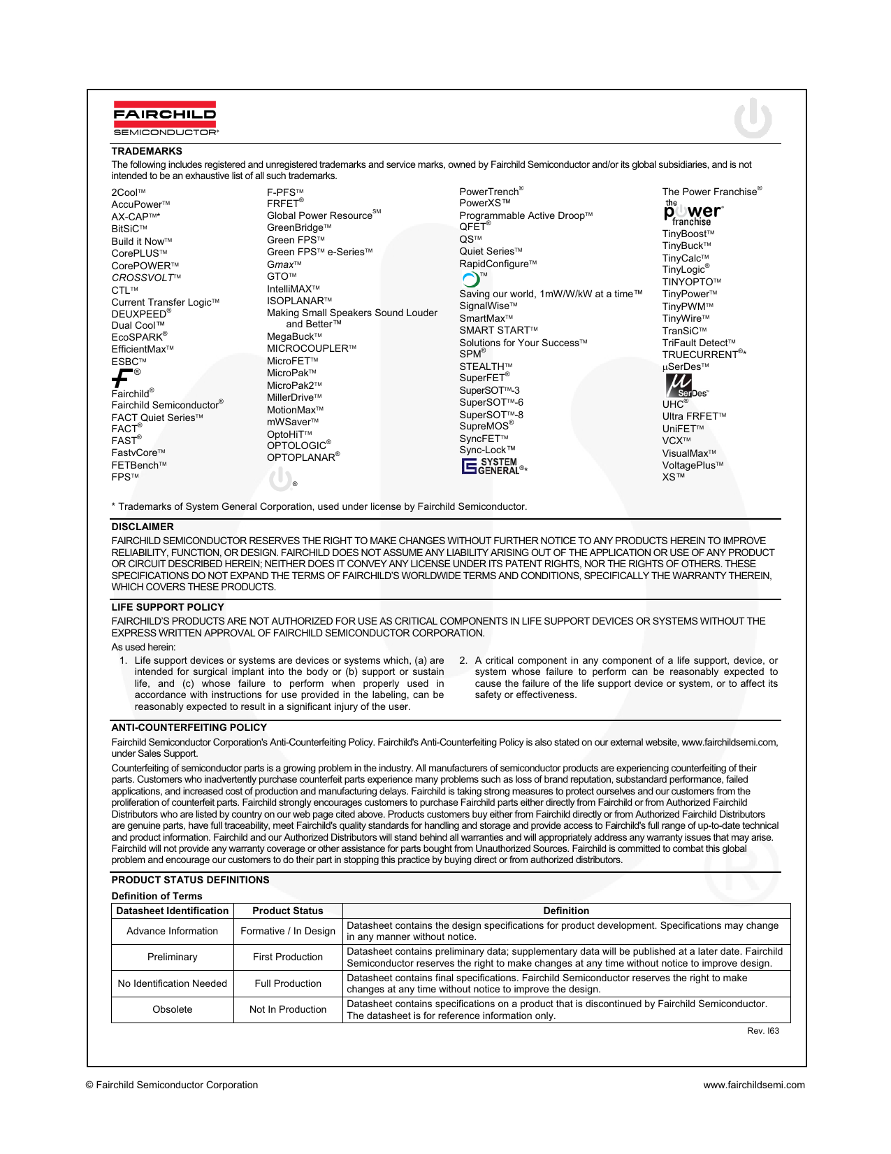 FAIRCHILD SEMICONDUCTOR RESERVES THE RIGHT TO MAKE CHANGES WITHOUT FURTHER NOTICE TO ANY PRODUCTS HEREIN TO IMPROVE RELIABILITY, FUNCTION, OR DESIGN. FAIRCHILD DOES NOT ASSUME ANY LIABILITY ARISING OUT OF THE APPLICATION OR USE OF ANY PRODUCT OR CIRCUIT DESCRIBED HEREIN; NEITHER DOES IT CONVEY ANY LICENSE UNDER ITS PATENT RIGHTS, NOR THE RIGHTS OF OTHERS. THESE SPECIFICATIONS DO NOT EXPAND THE TERMS OF FAIRCHILD’S WORLDWIDE TERMS AND CONDITIONS, SPECIFICALLY THE WARRANTY THEREIN, WHICH COVERS THESE PRODUCTS.