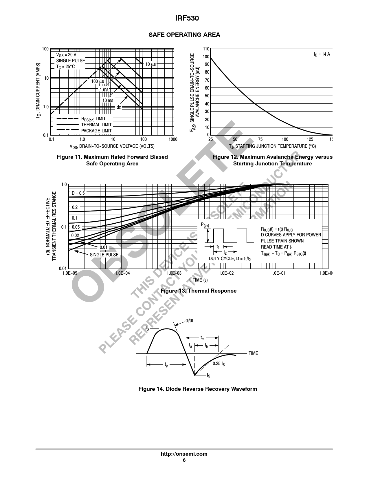 IRF530SAFE OPERATING AREA 100 110 V I GS = 20 V D = 14 A 100 SINGLE PULSE T 10μs 90 C = 25°C O−SOURCE (mJ) 80 (AMPS) 10 100μs 70 60 1ms 50 10ms 40 1.0 dc , DRAIN CURRENT 30 AVALANCHE ENERGY I D RDS(on) LIMIT 20 , SINGLE PULSE DRAIN−T THERMAL LIMIT 10 PACKAGE LIMIT E AS 0.1 0 0.1 1.0 10 100 1000 25 50 75 100 125 15 VDS, DRAIN−TO−SOURCE VOLTAGE (VOLTS) TJ, STARTING JUNCTION TEMPERATURE (°C) Figure 11. Maximum Rated Forward BiasedFigure 12. Maximum Avalanche Energy versusSafe Operating AreaStarting Junction Temperature 1.0 D = 0.5 ANCE 0.2 RESIST 0.1 P(pk) 0.1 0.05 RθJC(t) = r(t) RθJC THERMAL 0.02 D CURVES APPLY FOR POWER PULSE TRAIN SHOWN , NORMALIZED EFFECTIVE 0.01 t1 READ TIME AT t1 r(t) t2 TJ(pk) − TC = P(pk) RθJC(t) SINGLE PULSE TRANSIENT DUTY CYCLE, D = t1/t2 0.01 1.0E−05 1.0E−04 1.0E−03 1.0E−02 1.0E−01 1.0E+00 t, TIME (s) Figure 13. Thermal Response di/dt IS trr ta tb TIME tp 0.25 IS IS Figure 14. Diode Reverse Recovery Waveformhttp://onsemi.com6