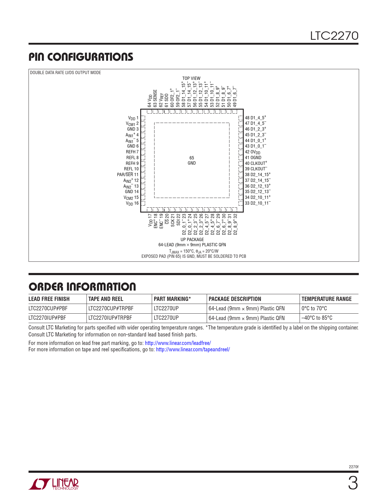 LTC2270CUP#PBF LTC2270CUP#TRPBF LTC2270UP 64-Lead (9mm × 9mm) Plastic QFN 0°C to 70°C LTC2270IUP#PBF LTC2270IUP#TRPBF LTC2270UP 64-Lead (9mm × 9mm) Plastic QFN –40°C to 85°C Consult LTC Marketing for parts specified with wider operating temperature ranges. *The temperature grade is identified by a label on the shipping container. Consult LTC Marketing for information on non-standard lead based finish parts. For more information on lead free part marking, go to: http://www.linear.com/leadfree/ For more information on tape and reel specifications, go to: http://www.linear.com/tapeandreel/ 2270f 3