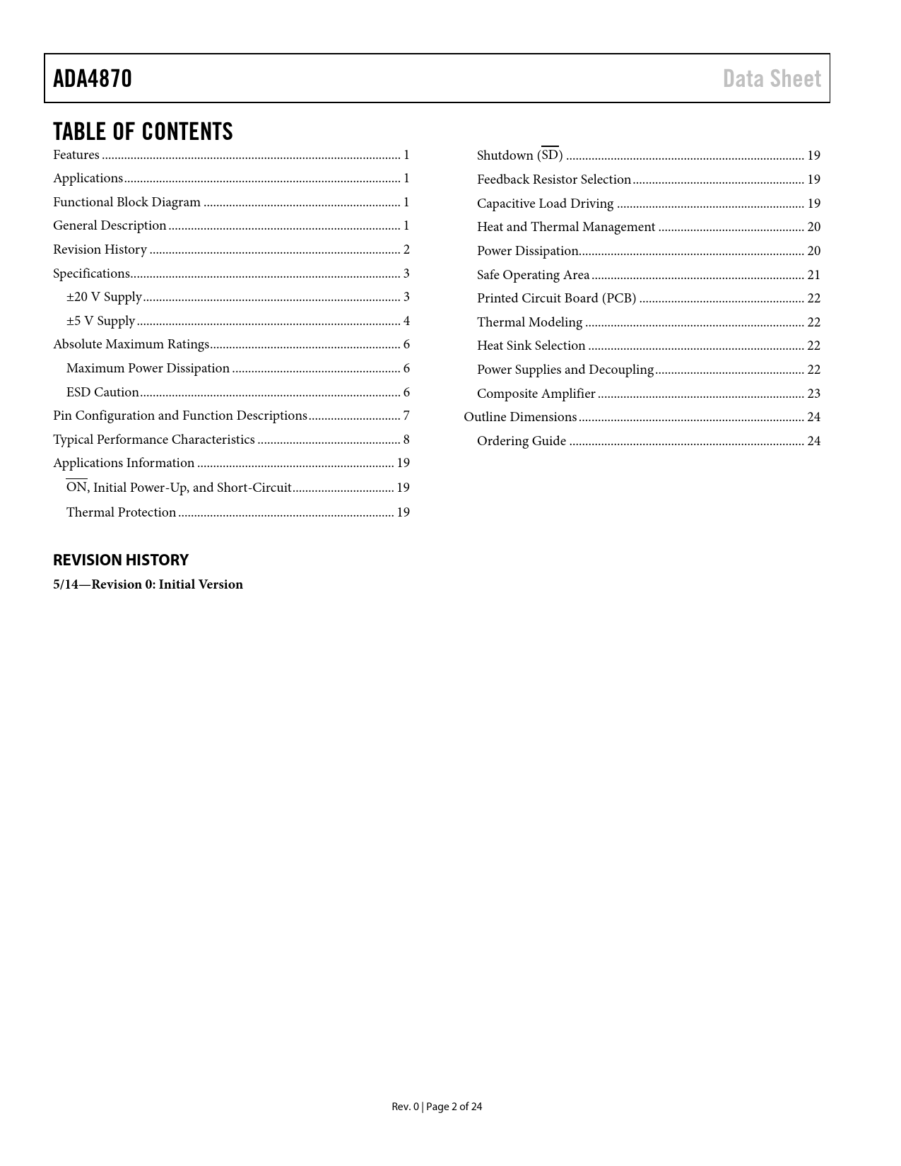 link to page 1 link to page 1 link to page 1 link to page 1 link to page 2 link to page 3 link to page 3 link to page 4 link to page 6 link to page 6 link to page 6 link to page 7 link to page 8 link to page 19 link to page 19 link to page 19 link to page 19 link to page 19 link to page 19 link to page 20 link to page 20 link to page 21 link to page 22 link to page 22 link to page 22 link to page 22 link to page 23 link to page 24 link to page 24 ADA4870Data SheetTABLE OF CONTENTS Features .. 1 Shutdown (SD) ... 19 Applications ... 1 Feedback Resistor Selection .. 19 Functional Block Diagram .. 1 Capacitive Load Driving ... 19 General Description ... 1 Heat and Thermal Management .. 20 Revision History ... 2 Power Dissipation... 20 Specifications ... 3 Safe Operating Area ... 21 ±20 V Supply ... 3 Printed Circuit Board (PCB) .. 22 ±5 V Supply ... 4 Thermal Modeling ... 22 Absolute Maximum Ratings .. 6 Heat Sink Selection .. 22 Maximum Power Dissipation ... 6 Power Supplies and Decoupling ... 22 ESD Caution .. 6 Composite Amplifier ... 23 Pin Configuration and Function Descriptions ... 7 Outline Dimensions ... 24 Typical Performance Characteristics ... 8 Ordering Guide .. 24 Applications Information .. 19 ON, Initial Power-Up, and Short-Circuit .. 19 Thermal Protection .. 19 REVISION HISTORY 5/14—Revision 0: Initial Version Rev. 0 | Page 2 of 24 Document Outline Features Applications Functional Block Diagram General Description Revision History Specifications ±20 V Supply ±5 V Supply Absolute Maximum Ratings Maximum Power Dissipation ESD Caution Pin Configuration and Function Descriptions Typical Performance Characteristics Applications Information , Initial Power-Up, and Short-Circuit Thermal Protection Shutdown () Feedback Resistor Selection Capacitive Load Driving Heat and Thermal Management Power Dissipation Safe Operating Area Printed Circuit Board (PCB) Thermal Modeling Heat Sink Selection Power Supplies and Decoupling Composite Amplifier Outline Dimensions Ordering Guide