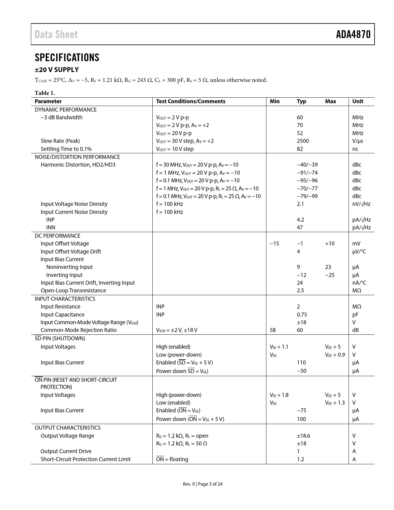 Data Sheet. ADA4870. SPECIFICATIONS ±20 V SUPPLY. Table 1. Parameter. Test Conditions/Comments. Min. Typ. Max. Unit