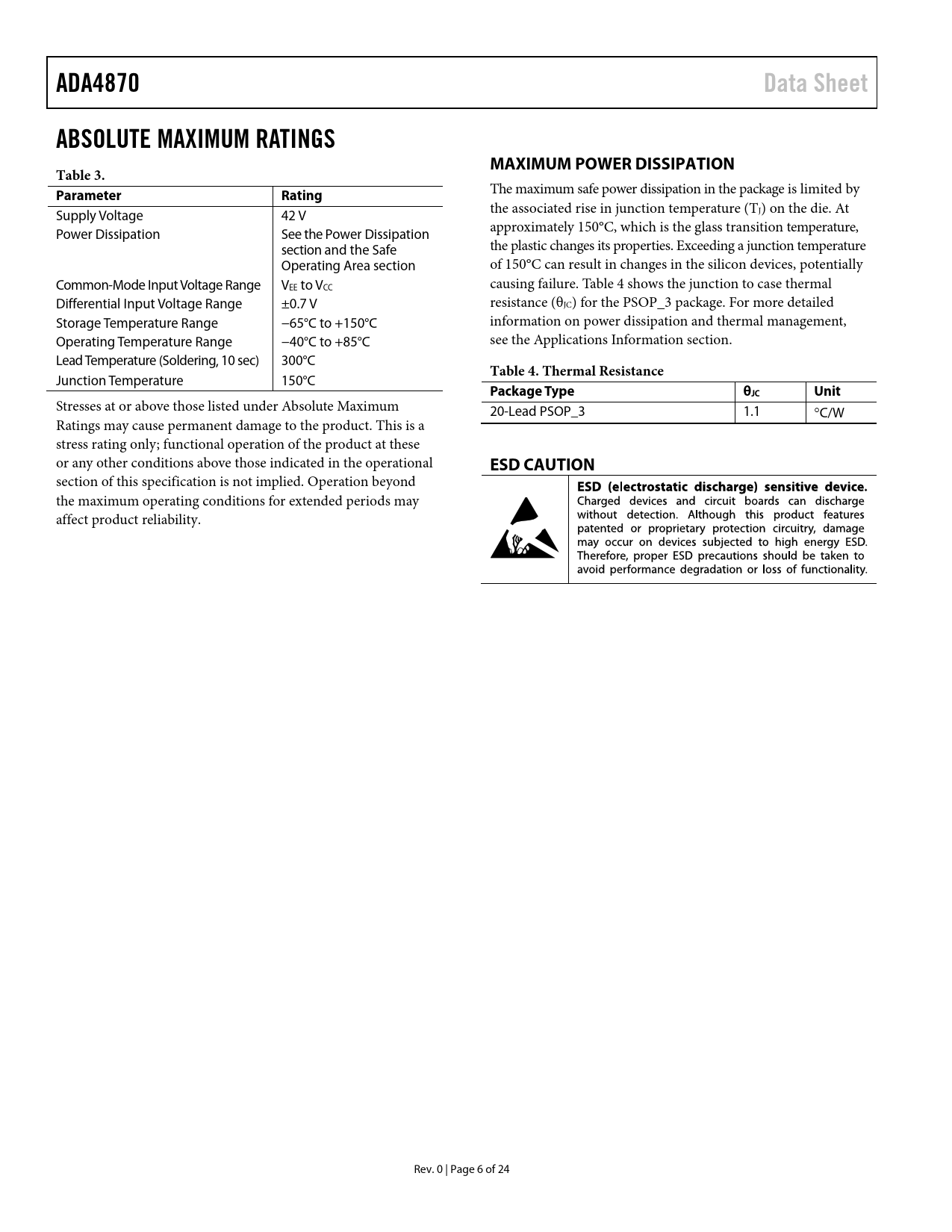 Pages / Page24 / 6 — ADA4870. Data Sheet. ABSOLUTE MAXIMUM RATINGS. MAXIMUM POWER DISSIPATION. …
