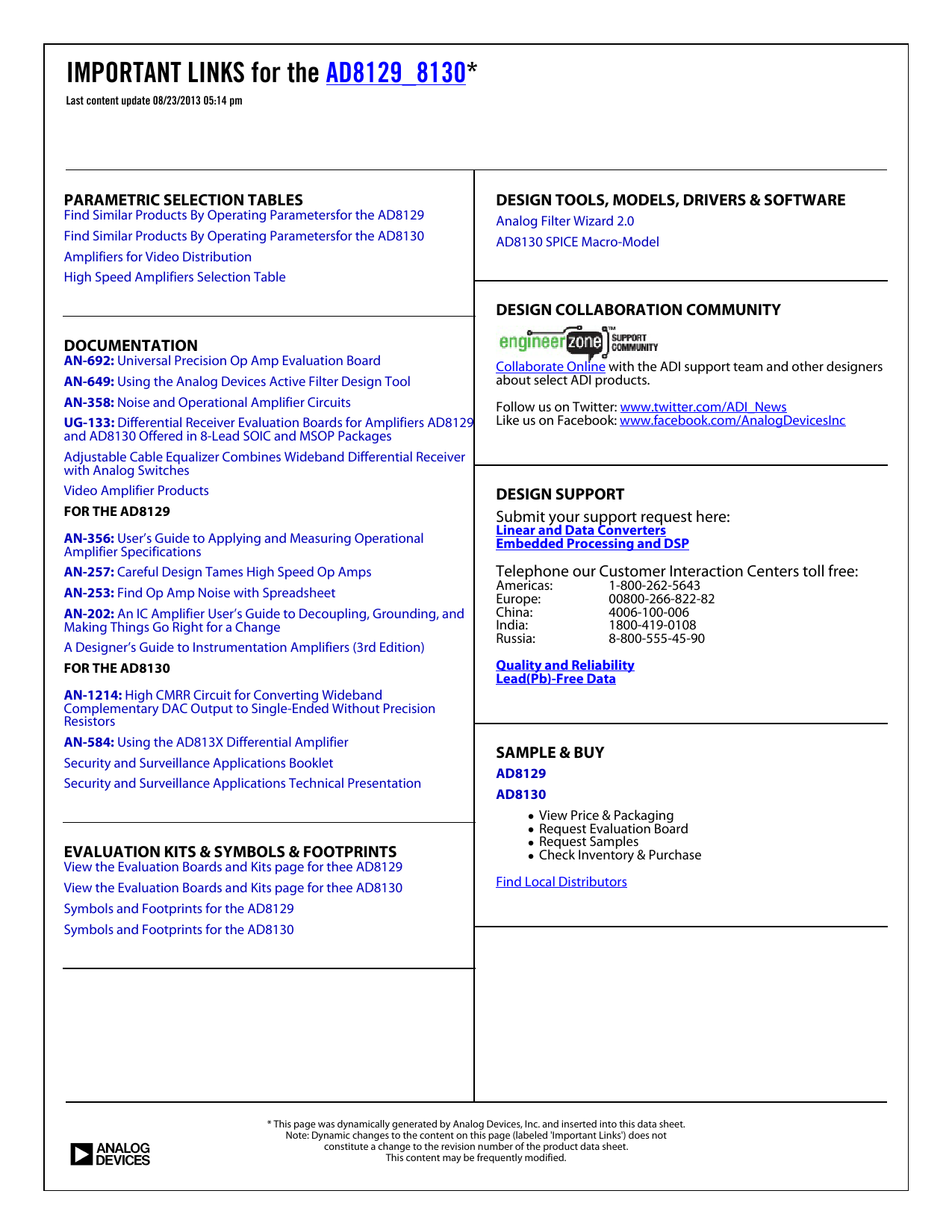 Differential Receiver Evaluation Boards for Amplifiers AD8129 Like us on Facebook: www.facebook.com/AnalogDevicesInc and AD8130 Offered in 8-Lead SOIC and MSOP Packages Adjustable Cable Equalizer Combines Wideband Differential Receiver with Analog Switches Video Amplifier Products
