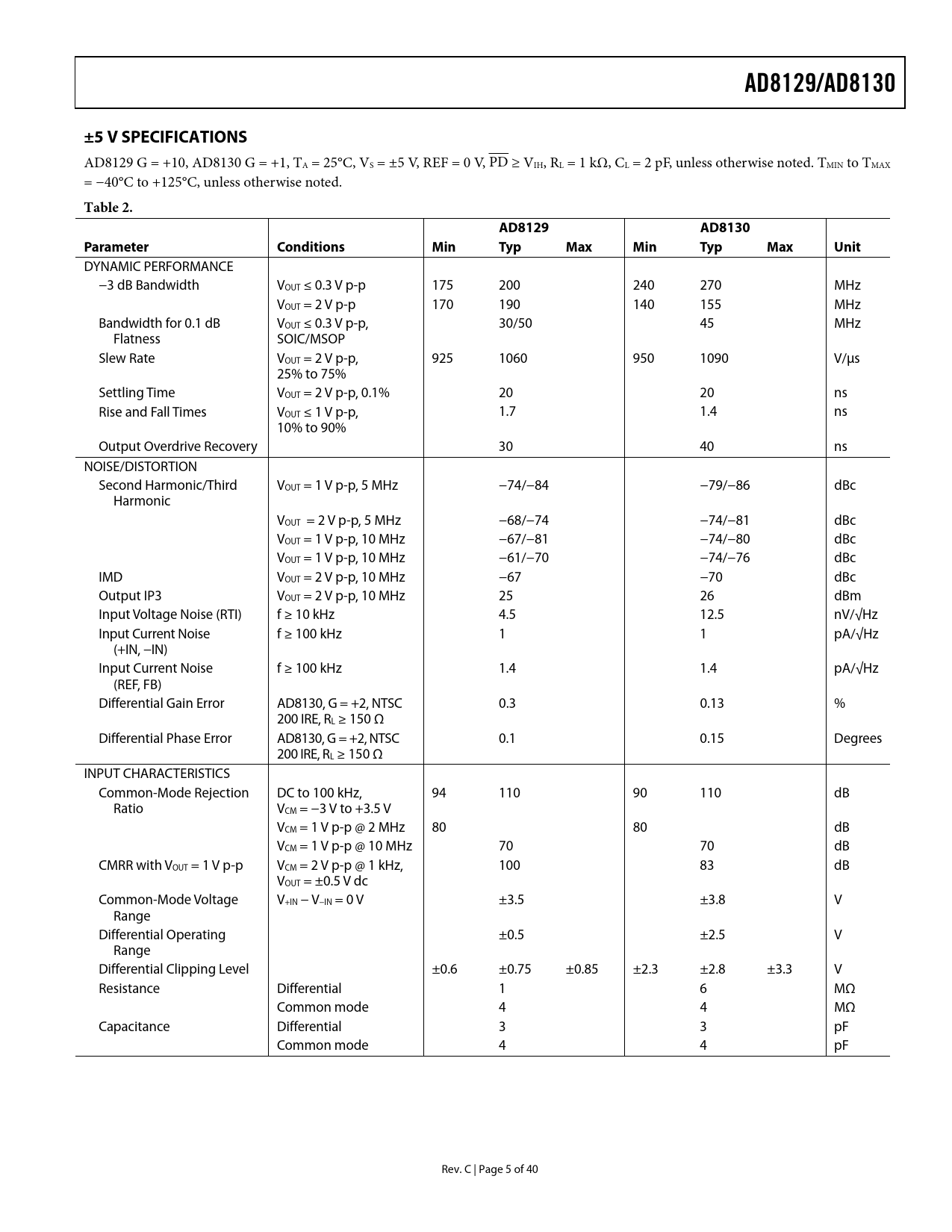 AD8129/AD8130. ±5 V SPECIFICATIONS. Table 2. AD8129. AD8130. Parameter. Conditions. Min Typ Max Min Typ Max Unit