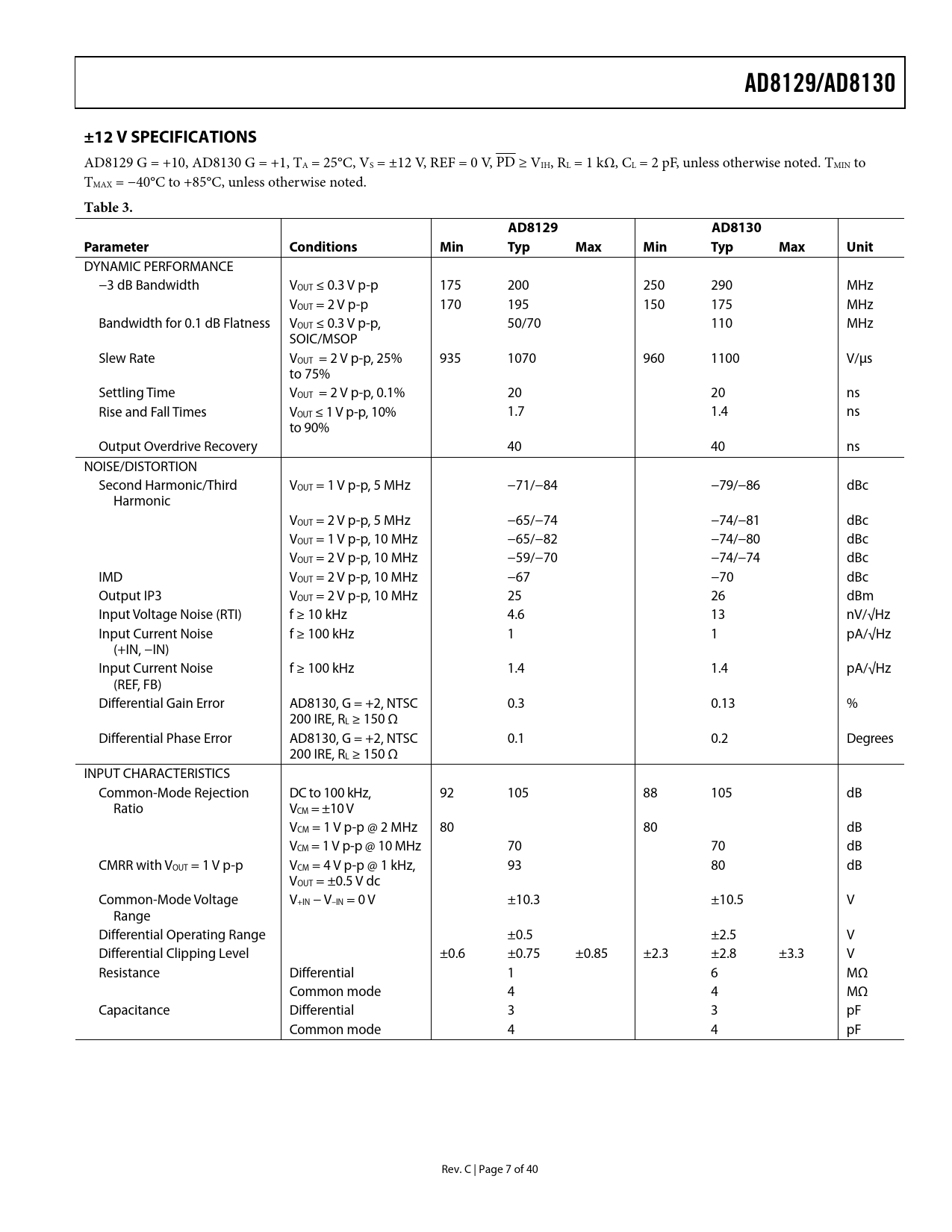 AD8129/AD8130. ±12 V SPECIFICATIONS. Table 3. AD8129. AD8130. Parameter. Conditions. Min Typ Max Min Typ Max Unit