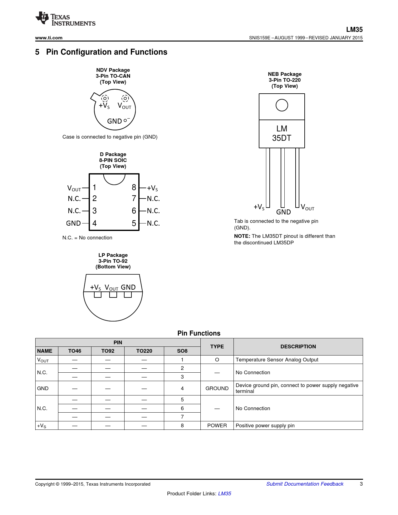 LM35. www.ti.com. 5 Pin Configuration and Functions. NDV Package. NEB Package. 3-Pin TO-CAN. 3-Pin TO-220. (Top View). D Package