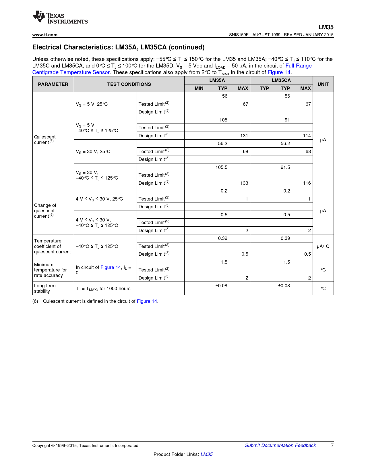 LM35. www.ti.com. Electrical Characteristics: LM35A, LM35CA (continued). LM35A. LM35CA. PARAMETER. TEST CONDITIONS. UNIT. MIN. TYP. MAX