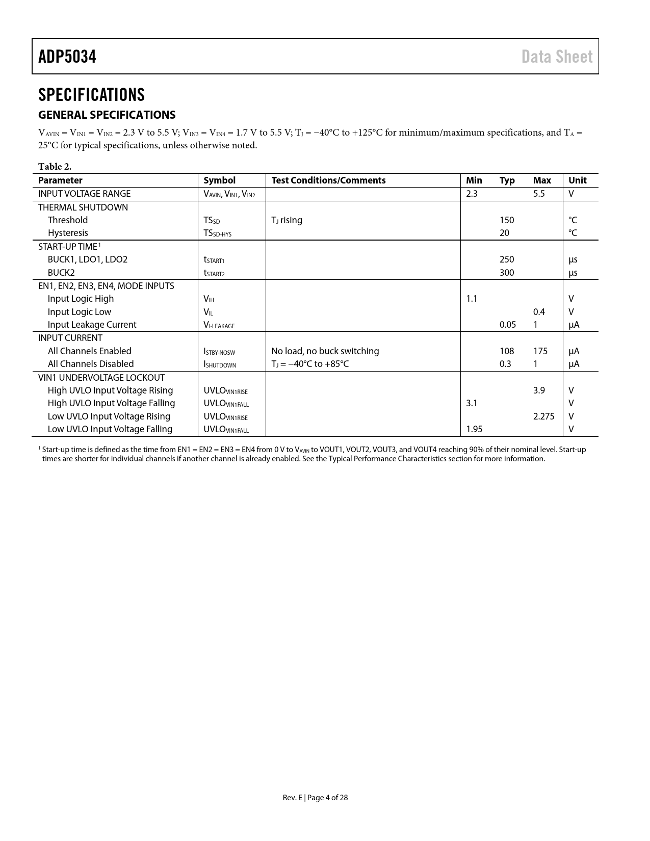 Pages / Page28 / 4 — ADP5034. Data Sheet. SPECIFICATIONS GENERAL SPECIFICATIONS. Table 2. …
