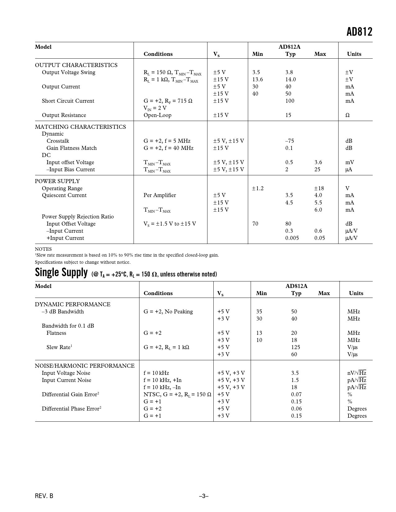 AD812ModelAD812AConditionsVMinTypMaxUnitsS OUTPUT CHARACTERISTICS Output Voltage Swing R = 150 Ω, T –T ±5 V 3.5 3.8 ±V L MIN MAX R = 1 kΩ, T –T ±15 V 13.6 14.0 ±V L MIN MAX Output Current ±5 V 30 40 mA ±15 V 40 50 mA Short Circuit Current G = +2, R = 715 Ω ±15 V 100 mA F V = 2 V IN Output Resistance Open-Loop ±15 V 15 Ω MATCHING CHARACTERISTICS Dynamic Crosstalk G = +2, f = 5 MHz ±5 V, ± 15 V –75 dB Gain Flatness Match G = +2, f = 40 MHz ±15 V 0.1 dB DC Input offset Voltage T –T ±5 V, ± 15 V 0.5 3.6 mV MIN MAX –Input Bias Current T –T ±5 V, ± 15 V 2 25 µA MIN MAX POWER SUPPLY Operating Range ±1.2 ±18 V Quiescent Current Per Amplifier ±5 V 3.5 4.0 mA ±15 V 4.5 5.5 mA T –T ±15 V 6.0 mA MIN MAX Power Supply Rejection Ratio Input Offset Voltage V = ± 1.5 V to ± 15 V 70 80 dB S –Input Current 0.3 0.6 µA/V +Input Current 0.005 0.05 µA/V NOTES 1Slew rate measurement is based on 10% to 90% rise time in the specified closed-loop gain. Specifications subject to change without notice. Single Supply (@ TA = +25 ⴗ C, RL = 150 ⍀ , unless otherwise noted) ModelAD812AConditionsVMinTypMaxUnitsS DYNAMIC PERFORMANCE –3 dB Bandwidth G = +2, No Peaking +5 V 35 50 MHz +3 V 30 40 MHz Bandwidth for 0.1 dB Flatness G = +2 +5 V 13 20 MHz +3 V 10 18 MHz Slew Rate1 G = +2, R = 1 kΩ +5 V 125 V/µs L +3 V 60 V/µs NOISE/HARMONIC PERFORMANCE Input Voltage Noise f = 10 kHz +5 V, +3 V 3.5 nV/√Hz Input Current Noise f = 10 kHz, +In +5 V, +3 V 1.5 pA/√Hz f = 10 kHz, –In +5 V, +3 V 18 pA/√Hz Differential Gain Error2 NTSC, G = +2, R = 150 Ω +5 V 0.07 % L G = +1 +3 V 0.15 % Differential Phase Error2 G = +2 +5 V 0.06 Degrees G = +1 +3 V 0.15 Degrees REV. B –3–