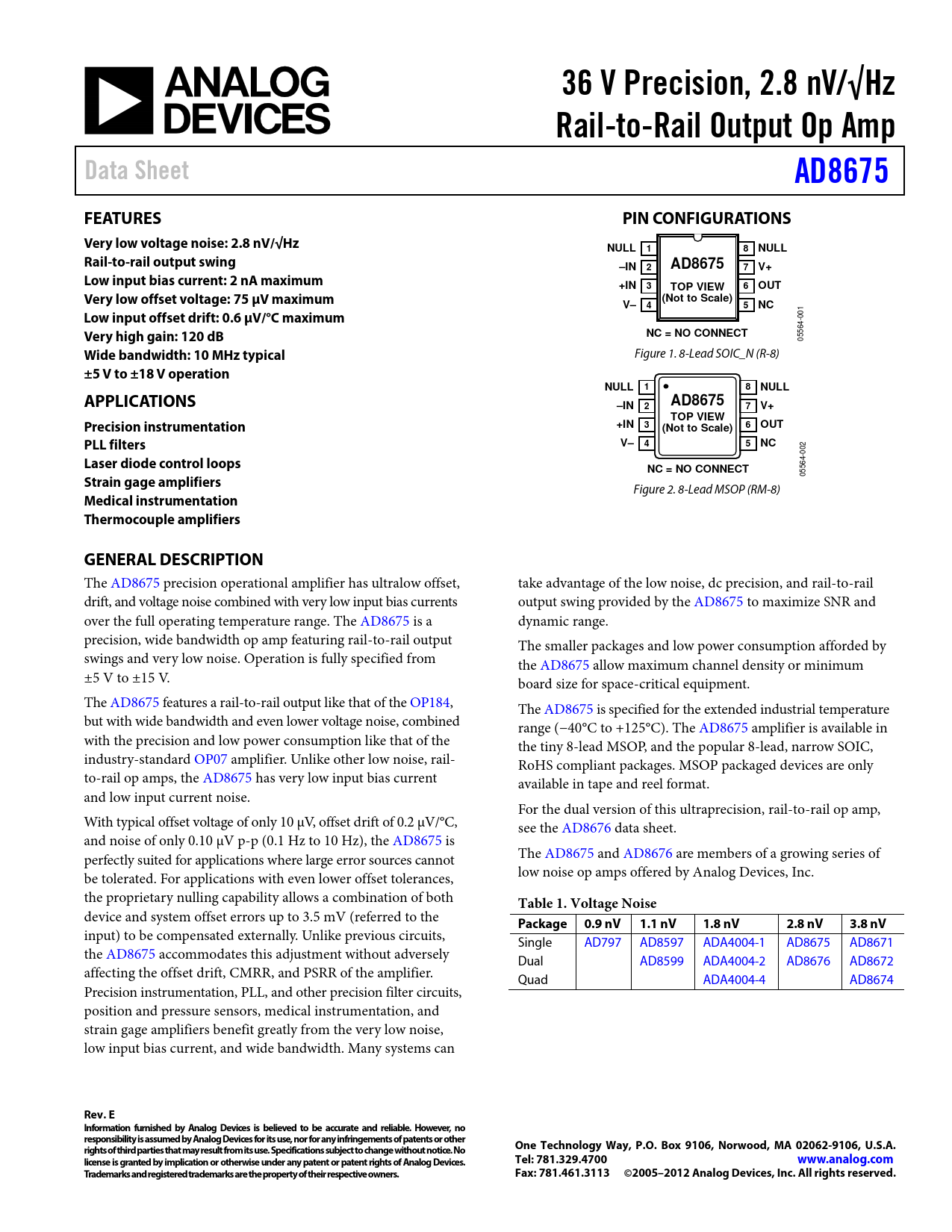 36 V Precision, 2.8 nV/√Hz. Rail-to-Rail Output Op Amp. Data Sheet. AD8675. FEATURES. PIN CONFIGURATIONS