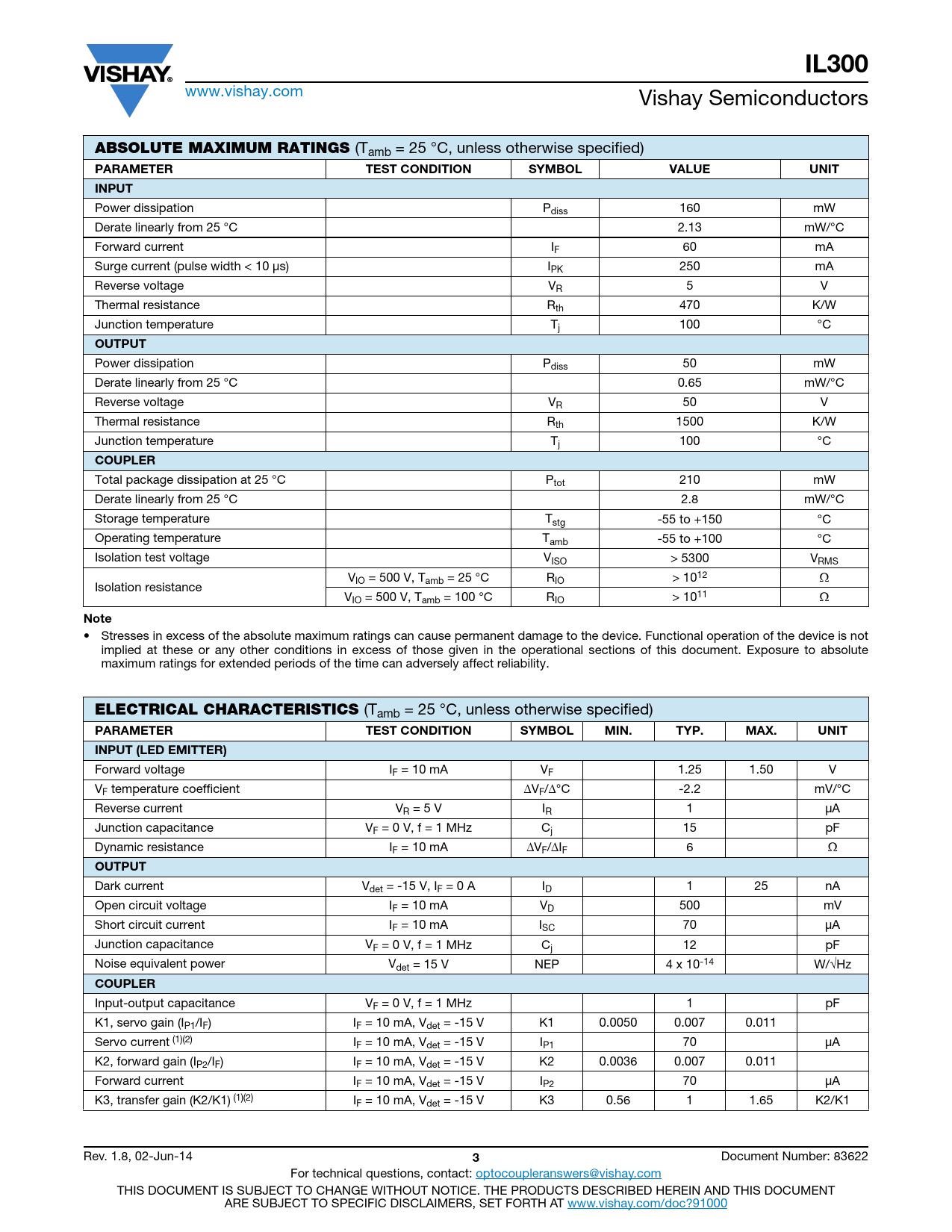 IL300 www.vishay.com Vishay Semiconductors ABSOLUTE MAXIMUM RATINGS (Tamb = 25 °C, unless otherwise specified) PARAMETERTEST CONDITIONSYMBOLVALUEUNITINPUT Power dissipation Pdiss 160 mW Derate linearly from 25 °C 2.13 mW/°C Forward current IF 60 mA Surge current (pulse width < 10 μs) IPK 250 mA Reverse voltage VR 5 V Thermal resistance Rth 470 K/W Junction temperature Tj 100 °C OUTPUT Power dissipation Pdiss 50 mW Derate linearly from 25 °C 0.65 mW/°C Reverse voltage VR 50 V Thermal resistance Rth 1500 K/W Junction temperature Tj 100 °C COUPLER Total package dissipation at 25 °C Ptot 210 mW Derate linearly from 25 °C 2.8 mW/°C Storage temperature Tstg -55 to +150 °C Operating temperature Tamb -55 to +100 °C Isolation test voltage VISO > 5300 VRMS VIO = 500 V, Tamb = 25 °C RIO > 1012 Isolation resistance VIO = 500 V, Tamb = 100 °C RIO > 1011 Note • Stresses in excess of the absolute maximum ratings can cause permanent damage to the device. Functional operation of the device is not implied at these or any other conditions in excess of those given in the operational sections of this document. Exposure to absolute maximum ratings for extended periods of the time can adversely affect reliability. ELECTRICAL CHARACTERISTICS (Tamb = 25 °C, unless otherwise specified) PARAMETERTEST CONDITIONSYMBOLMIN.TYP.MAX.UNITINPUT (LED EMITTER) Forward voltage IF = 10 mA VF 1.25 1.50 V VF temperature coefficient VF/°C -2.2 mV/°C Reverse current VR = 5 V IR 1 μA Junction capacitance VF = 0 V, f = 1 MHz Cj 15 pF Dynamic resistance IF = 10 mA VF/IF 6 OUTPUT Dark current Vdet = -15 V, IF = 0 A ID 1 25 nA Open circuit voltage IF = 10 mA VD 500 mV Short circuit current IF = 10 mA ISC 70 μA Junction capacitance VF = 0 V, f = 1 MHz Cj 12 pF Noise equivalent power Vdet = 15 V NEP 4 x 10-14 W/Hz COUPLER Input-output capacitance VF = 0 V, f = 1 MHz 1 pF K1, servo gain (IP1/IF) IF = 10 mA, Vdet = -15 V K1 0.0050 0.007 0.011 Servo current (1)(2) IF = 10 mA, Vdet = -15 V IP1 70 μA K2, forward gain (IP2/IF) IF = 10 mA, Vdet = -15 V K2 0.0036 0.007 0.011 Forward current IF = 10 mA, Vdet = -15 V IP2 70 μA K3, transfer gain (K2/K1) (1)(2) IF = 10 mA, Vdet = -15 V K3 0.56 1 1.65 K2/K1 Rev. 1.8, 02-Jun-14 3 Document Number: 83622 For technical questions, contact: optocoupleranswers@vishay.com THIS DOCUMENT IS SUBJECT TO CHANGE WITHOUT NOTICE. THE PRODUCTS DESCRIBED HEREIN AND THIS DOCUMENT ARE SUBJECT TO SPECIFIC DISCLAIMERS, SET FORTH AT www.vishay.com/doc?91000