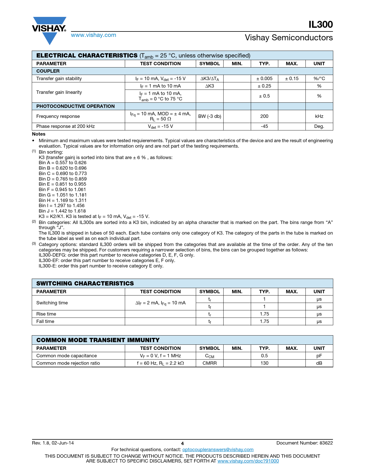 IL300 www.vishay.com Vishay Semiconductors ELECTRICAL CHARACTERISTICS (Tamb = 25 °C, unless otherwise specified) PARAMETERTEST CONDITIONSYMBOLMIN.TYP.MAX.UNITCOUPLER Transfer gain stability IF = 10 mA, Vdet = -15 V K3/TA ± 0.005 ± 0.15 %/°C IF = 1 mA to 10 mA K3 ± 0.25 % Transfer gain linearity IF = 1 mA to 10 mA, ± 0.5 % Tamb = 0 °C to 75 °C PHOTOCONDUCTIVE OPERATION I Frequency response Fq = 10 mA, MOD = ± 4 mA, RL = 50 BW (-3 db) 200 kHz Phase response at 200 kHz Vdet = -15 V -45 Deg. Notes • Minimum and maximum values were tested requierements. Typical values are characteristics of the device and are the result of engineering evaluation. Typical values are for information only and are not part of the testing requirements. (1) Bin sorting: K3 (transfer gain) is sorted into bins that are ± 6 % , as follows: Bin A = 0.557 to 0.626 Bin B = 0.620 to 0.696 Bin C = 0.690 to 0.773 Bin D = 0.765 to 0.859 Bin E = 0.851 to 0.955 Bin F = 0.945 to 1.061 Bin G = 1.051 to 1.181 Bin H = 1.169 to 1.311 Bin I = 1.297 to 1.456 Bin J = 1.442 to 1.618 K3 = K2/K1. K3 is tested at IF = 10 mA, Vdet = -15 V. (2) Bin categories: All IL300s are sorted into a K3 bin, indicated by an alpha character that is marked on the part. The bins range from “A” through “J”. The IL300 is shipped in tubes of 50 each. Each tube contains only one category of K3. The category of the parts in the tube is marked on the tube label as well as on each individual part. (3) Category options: standard IL300 orders will be shipped from the categories that are available at the time of the order. Any of the ten categories may be shipped. For customers requiring a narrower selection of bins, the bins can be grouped together as follows: IL300-DEFG: order this part number to receive categories D, E, F, G only. IL300-EF: order this part number to receive categories E, F only. IL300-E: order this part number to receive category E only. SWITCHING CHARACTERISTICSPARAMETERTEST CONDITIONSYMBOLMIN.TYP.MAX.UNIT tr 1 μs Switching time IF = 2 mA, IFq = 10 mA tf 1 μs Rise time tr 1.75 μs Fall time tf 1.75 μs COMMON MODE TRANSIENT IMMUNITYPARAMETERTEST CONDITIONSYMBOLMIN.TYP.MAX.UNIT Common mode capacitance VF = 0 V, f = 1 MHz CCM 0.5 pF Common mode rejection ratio f = 60 Hz, RL = 2.2 k CMRR 130 dB Rev. 1.8, 02-Jun-14 4 Document Number: 83622 For technical questions, contact: optocoupleranswers@vishay.com THIS DOCUMENT IS SUBJECT TO CHANGE WITHOUT NOTICE. THE PRODUCTS DESCRIBED HEREIN AND THIS DOCUMENT ARE SUBJECT TO SPECIFIC DISCLAIMERS, SET FORTH AT www.vishay.com/doc?91000