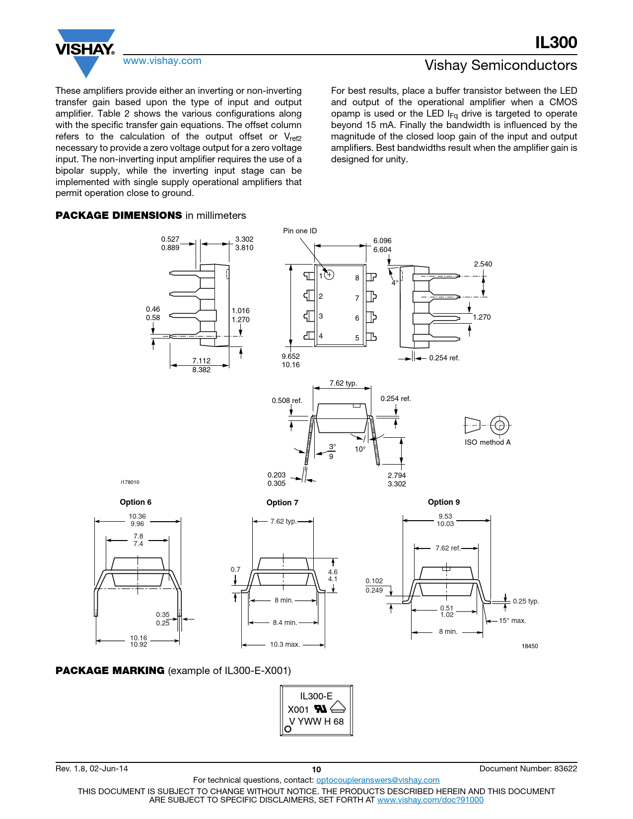 IL300 www.vishay.com Vishay Semiconductors These amplifiers provide either an inverting or non-inverting For best results, place a buffer transistor between the LED transfer gain based upon the type of input and output and output of the operational amplifier when a CMOS amplifier. Table 2 shows the various configurations along opamp is used or the LED IFq drive is targeted to operate with the specific transfer gain equations. The offset column beyond 15 mA. Finally the bandwidth is influenced by the refers to the calculation of the output offset or Vref2 magnitude of the closed loop gain of the input and output necessary to provide a zero voltage output for a zero voltage amplifiers. Best bandwidths result when the amplifier gain is input. The non-inverting input amplifier requires the use of a designed for unity. bipolar supply, while the inverting input stage can be implemented with single supply operational amplifiers that permit operation close to ground. PACKAGE DIMENSIONS in millimeters Pin one ID 0.527 3.302 6.096 0.889 3.810 6.604 2.540 1 8 4° 2 7 0.46 1.016 3 0.58 1.270 6 1.270 4 5 9.652 7.112 0.254 ref. 10.16 8.382 7.62 typ. 0.508 ref. 0.254 ref. ISO method A 3° 10° 9 0.203 2.794 i178010 0.305 3.302 Option 6Option 7Option 9 10.36 9.53 9.96 7.62 typ. 10.03 7.8 7.4 7.62 ref. 0.7 4.6 4.1 0.102 0.249 8 min. 0.25 typ. 0.51 0.35 1.02 15° max. 0.25 8.4 min. 8 min. 10.16 10.92 10.3 max. 18450 PACKAGE MARKING (example of IL300-E-X001) IL300-E X001 V YWW H 68 Rev. 1.8, 02-Jun-14 10 Document Number: 83622 For technical questions, contact: optocoupleranswers@vishay.com THIS DOCUMENT IS SUBJECT TO CHANGE WITHOUT NOTICE. THE PRODUCTS DESCRIBED HEREIN AND THIS DOCUMENT ARE SUBJECT TO SPECIFIC DISCLAIMERS, SET FORTH AT www.vishay.com/doc?91000