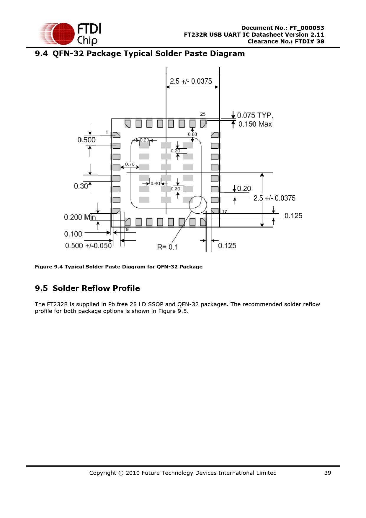 Document No.: FT_000053 FT232R USB UART IC Datasheet Version 2.11 Clearance No.: FTDI# 38 9.4 QFN-32 Package Typical Solder Paste Diagram