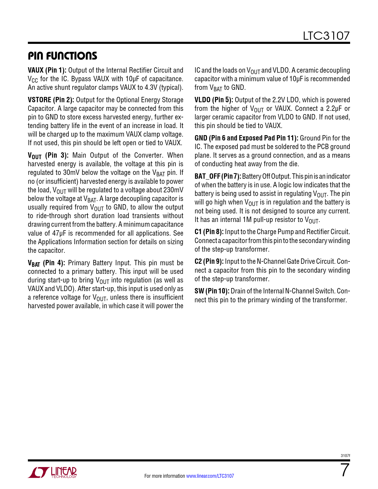 Pages / Page24 / 7 — pin FuncTions VAUX (Pin 1):. VSTORE (Pin 2):. VLDO (Pin 5):. GND (Pin 6 …