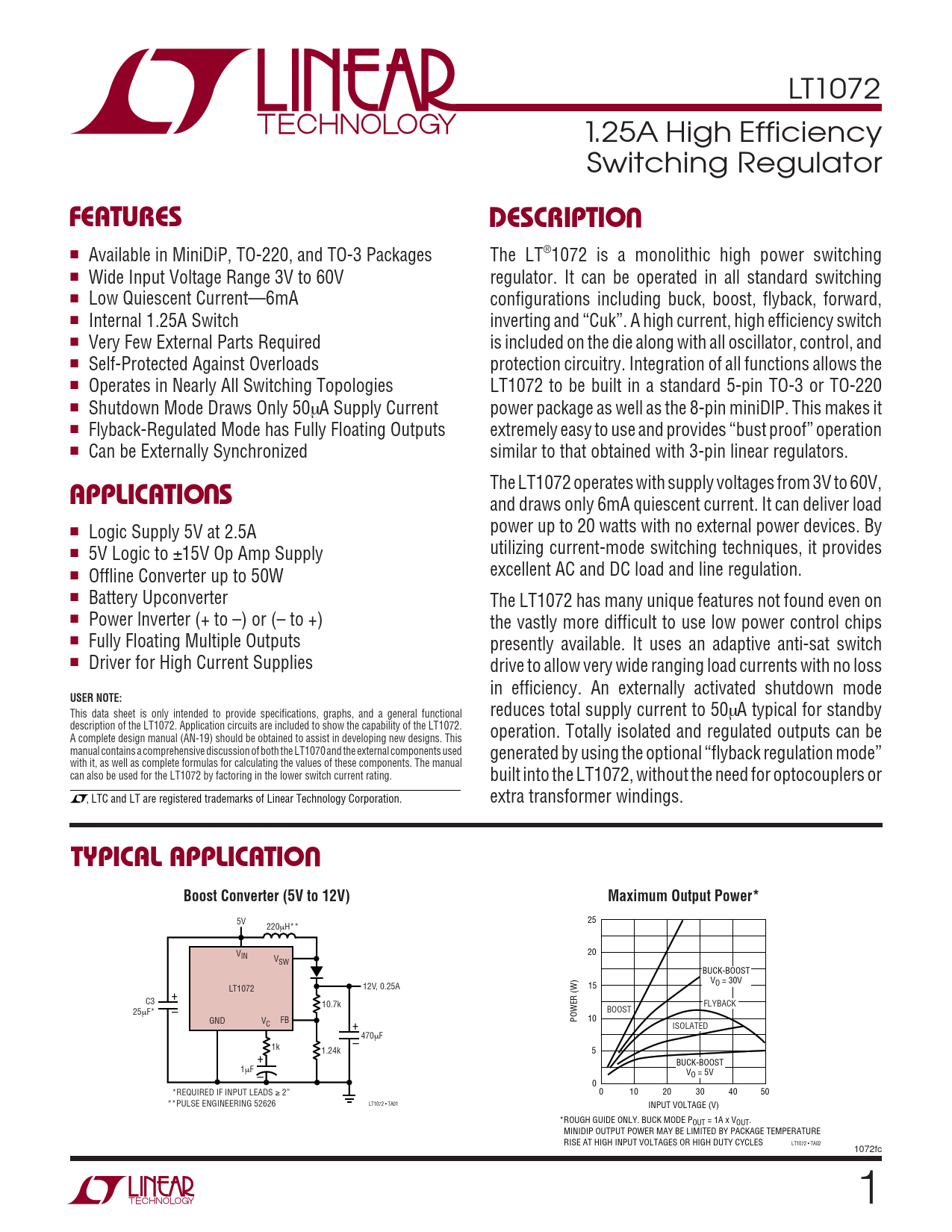■ Available in MiniDiP, TO-220, and TO-3 Packages The LT®1072 is a monolithic high power switching ■ Wide Input Voltage Range 3V to 60V regulator. It can be operated in all standard switching ■ Low Quiescent Current—6mA configurations including buck, boost, flyback, forward, ■ Internal 1.25A Switch inverting and “Cuk”. A high current, high efficiency switch ■ Very Few External Parts Required is included on the die along with all oscillator, control, and ■ Self-Protected Against Overloads protection circuitry. Integration of all functions allows the ■ Operates in Nearly All Switching Topologies LT1072 to be built in a standard 5-pin TO-3 or TO-220 ■ Shutdown Mode Draws Only 50µA Supply Current power package as well as the 8-pin miniDlP. This makes it ■ Flyback-Regulated Mode has Fully Floating Outputs extremely easy to use and provides “bust proof” operation ■ Can be Externally Synchronized similar to that obtained with 3-pin linear regulators.