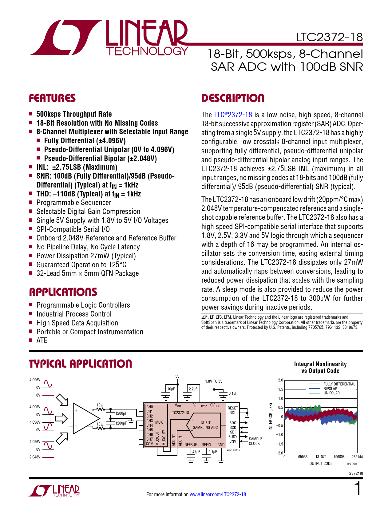 LTC2372-18 18-Bit, 500ksps, 8-Channel SAR ADC with 100dB SNR FeaTuresDescripTion n 500ksps Throughput Rate The LTC®2372-18 is a low noise, high speed, 8-channel n 18-Bit Resolution with No Missing Codes 18-bit successive approximation register (SAR) ADC. Oper- n 8-Channel Multiplexer with Selectable Input Range ating from a single 5V supply, the LTC2372-18 has a highly n Fully Differential (±4.096V) configurable, low crosstalk 8-channel input multiplexer, n Pseudo-Differential Unipolar (0V to 4.096V) supporting fully differential, pseudo-differential unipolar n Pseudo-Differential Bipolar (±2.048V) and pseudo-differential bipolar analog input ranges. The n INL: ±2.75LSB (Maximum) LTC2372-18 achieves ±2.75LSB INL (maximum) in all n SNR: 100dB (Fully Differential)/95dB (Pseudo- input ranges, no missing codes at 18-bits and 100dB (fully Differential) (Typical) at fIN = 1kHz differential)/ 95dB (pseudo-differential) SNR (typical). n THD: –110dB (Typical) at fIN = 1kHz n The LTC2372-18 has an onboard low drift (20ppm/°C max) Programmable Sequencer n 2.048V temperature-compensated reference and a single- Selectable Digital Gain Compression n shot capable reference buffer. The LTC2372-18 also has a Single 5V Supply with 1.8V to 5V I/O Voltages n high speed SPI-compatible serial interface that supports SPI-Compatible Serial I/O n 1.8V, 2.5V, 3.3V and 5V logic through which a sequencer Onboard 2.048V Reference and Reference Buffer n with a depth of 16 may be programmed. An internal os- No Pipeline Delay, No Cycle Latency n cillator sets the conversion time, easing external timing Power Dissipation 27mW (Typical) n considerations. The LTC2372-18 dissipates only 27mW Guaranteed Operation to 125°C n and automatically naps between conversions, leading to 32-Lead 5mm × 5mm QFN Package reduced power dissipation that scales with the sampling applicaTions rate. A sleep mode is also provided to reduce the power consumption of the LTC2372-18 to 300μW for further n Programmable Logic Controllers power savings during inactive periods. n Industrial Process Control L, LT, LTC, LTM, Linear Technology and the Linear logo are registered trademarks and n SoftSpan is a trademark of Linear Technology Corporation. All other trademarks are the property High Speed Data Acquisition of their respective owners. Protected by U.S. Patents, including 7705765, 7961132, 8319673. n Portable or Compact Instrumentation n ATE Typical applicaTionIntegral Nonlinearityvs Output Code 5V 4.096V 1.8V TO 5V 2.0 FULLY DIFFERENTIAL 0V 10µF 2.2µF 1.5 BIPOLAR 0.1µF 0V UNIPOLAR 1.0 10Ω 4.096V CH0 VDD VDDLBYP OVDD RESET + 0.5 1200pF CH1 LTC2372-18 RDL 0V CH2 0 CH3 + 4.096V 10Ω 1200pF MUX 18-BIT SDO – CH4 SAMPLING ADC SCK –0.5 0V CH5 – + – INL ERROR (LSB) SDI CH6 + – BUSY –1.0 CH7 SAMPLE 4.096V CNV COM MUXOUT MUXOUT CLOCK ADCIN ADCIN REFBUF REFIN GND –1.5 0V 237218 TA01a 47µF 0.1µF –2.0 2.048V 0 65536 131072 196608 262144 OUTPUT CODE 2372 TA01b 237218f For more information www.linear.com/LTC2372-18 1 Document Outline Features Applications Description Typical Application Absolute Maximum Ratings Pin Configuration Order Information Electrical Characteristics Converter Characteristics Dynamic Accuracy Internal Reference Characteristics Reference Buffer Characteristics Digital Inputs and Digital Outputs Power Requirements ADC Timing Characteristics Electrical Characteristics Typical Performance Characteristics Pin Functions Functional Block Diagram Timing Diagram Applications Information Timing Diagrams Board Layout Schematics Package Description Typical Application Related Parts