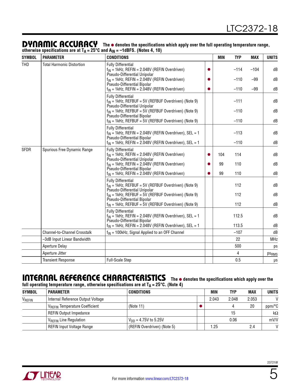 LTC2372-18 DynaMic accuracy The l denotes the specifications which apply over the full operating temperature range,otherwise specifications are at TA = 25°C and AIN = –1dBFS. (Notes 4, 10)SYMBOLPARAMETERCONDITIONSMINTYPMAXUNITS THD Total Harmonic Distortion Fully Differential fIN = 1kHz, REFIN = 2.048V (REFIN Overdriven) l –114 –104 dB Pseudo-Differential Unipolar fIN = 1kHz, REFIN = 2.048V (REFIN Overdriven) l –110 –99 dB Pseudo-Differential Bipolar fIN = 1kHz, REFIN = 2.048V (REFIN Overdriven) l –110 –99 dB Fully Differential fIN = 1kHz, REFBUF = 5V (REFBUF Overdriven) (Note 9) –111 dB Pseudo-Differential Unipolar fIN = 1kHz, REFBUF = 5V (REFBUF Overdriven) (Note 9) –110 dB Pseudo-Differential Bipolar fIN = 1kHz, REFBUF = 5V (REFBUF Overdriven) (Note 9) –110 dB Fully Differential fIN = 1kHz, REFIN = 2.048V (REFIN Overdriven), SEL = 1 –113 dB Pseudo-Differential Bipolar fIN = 1kHz, REFIN = 2.048V (REFIN Overdriven), SEL = 1 –110 dB SFDR Spurious Free Dynamic Range Fully Differential fIN = 1kHz, REFIN = 2.048V (REFIN Overdriven) l 104 114 dB Pseudo-Differential Unipolar fIN = 1kHz, REFIN = 2.048V (REFIN Overdriven) l 99 110 dB Pseudo-Differential Bipolar fIN = 1kHz, REFIN = 2.048V (REFIN Overdriven) l 99 110 dB Fully Differential fIN = 1kHz, REFBUF = 5V (REFBUF Overdriven) (Note 9) 112 dB Pseudo-Differential Unipolar fIN = 1kHz, REFBUF = 5V (REFBUF Overdriven) (Note 9) 112 dB Pseudo-Differential Bipolar fIN = 1kHz, REFBUF = 5V (REFBUF Overdriven) (Note 9) 112 dB Fully Differential fIN = 1kHz, REFIN = 2.048V (REFIN Overdriven), SEL = 1 112.5 dB Pseudo-Differential Bipolar fIN = 1kHz, REFIN = 2.048V (REFIN Overdriven), SEL = 1 113.5 dB Channel-to-Channel Crosstalk fIN = 100kHz, Signal Applied to an OFF Channel –107 dB –3dB Input Linear Bandwidth 22 MHz Aperture Delay 500 ps Aperture Jitter 4 psRMS Transient Response Full-Scale Step 0.5 µs i nTernal reFerence characTerisTics The l denotes the specifications which apply over thefull operating temperature range, otherwise specifications are at TA = 25°C. (Note 4) SYMBOLPARAMETERCONDITIONSMINTYPMAXUNITS VREFIN Internal Reference Output Voltage 2.043 2.048 2.053 V VREFIN Temperature Coefficient (Note 11) l 4 20 ppm/°C REFIN Output Impedance 15 kΩ VREFIN Line Regulation VDD = 4.75V to 5.25V 0.06 mV/V REFIN Input Voltage Range (REFIN Overdriven) (Note 5) 1.25 2.4 V 237218f For more information www.linear.com/LTC2372-18 5 Document Outline Features Applications Description Typical Application Absolute Maximum Ratings Pin Configuration Order Information Electrical Characteristics Converter Characteristics Dynamic Accuracy Internal Reference Characteristics Reference Buffer Characteristics Digital Inputs and Digital Outputs Power Requirements ADC Timing Characteristics Electrical Characteristics Typical Performance Characteristics Pin Functions Functional Block Diagram Timing Diagram Applications Information Timing Diagrams Board Layout Schematics Package Description Typical Application Related Parts
