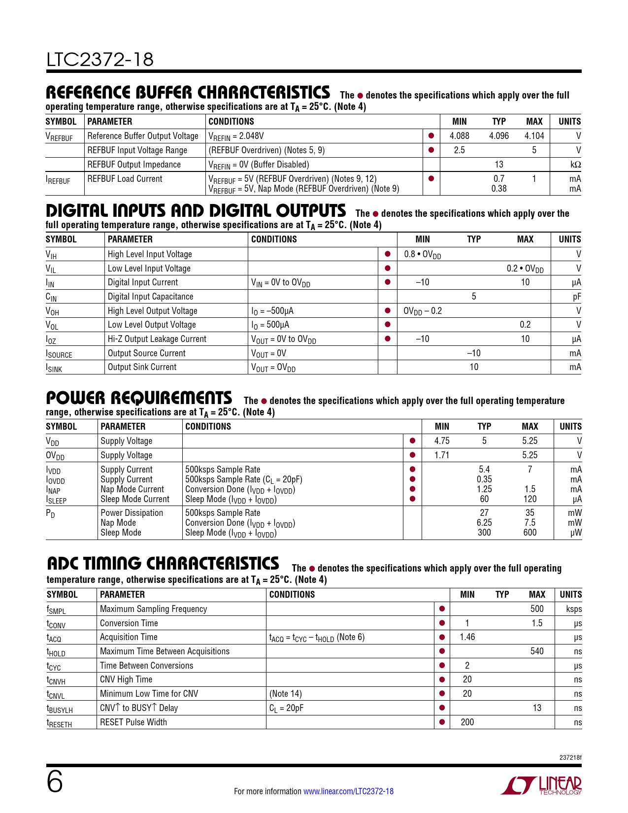 LTC2372-18 reFerence buFFer characTerisTics The l denotes the specifications which apply over the fulloperating temperature range, otherwise specifications are at TA = 25°C. (Note 4) SYMBOL PARAMETERCONDITIONSMINTYPMAXUNITS VREFBUF Reference Buffer Output Voltage VREFIN = 2.048V l 4.088 4.096 4.104 V REFBUF Input Voltage Range (REFBUF Overdriven) (Notes 5, 9) l 2.5 5 V REFBUF Output Impedance VREFIN = 0V (Buffer Disabled) 13 kΩ IREFBUF REFBUF Load Current VREFBUF = 5V (REFBUF Overdriven) (Notes 9, 12) l 0.7 1 mA VREFBUF = 5V, Nap Mode (REFBUF Overdriven) (Note 9) 0.38 mA DigiTal inpuTs anD DigiTal ouTpuTs The l denotes the specifications which apply over thefull operating temperature range, otherwise specifications are at TA = 25°C. (Note 4) SYMBOLPARAMETERCONDITIONSMINTYPMAXUNITS VIH High Level Input Voltage l 0.8 • OVDD V VIL Low Level Input Voltage l 0.2 • OVDD V IIN Digital Input Current VIN = 0V to OVDD l –10 10 μA CIN Digital Input Capacitance 5 pF VOH High Level Output Voltage IO = –500µA l OVDD – 0.2 V VOL Low Level Output Voltage IO = 500µA l 0.2 V IOZ Hi-Z Output Leakage Current VOUT = 0V to OVDD l –10 10 µA ISOURCE Output Source Current VOUT = 0V –10 mA ISINK Output Sink Current VOUT = OVDD 10 mA p ower requireMenTs The l denotes the specifications which apply over the full operating temperaturerange, otherwise specifications are at TA = 25°C. (Note 4) SYMBOLPARAMETERCONDITIONSMINTYPMAXUNITS VDD Supply Voltage l 4.75 5 5.25 V OVDD Supply Voltage l 1.71 5.25 V IVDD Supply Current 500ksps Sample Rate l 5.4 7 mA IOVDD Supply Current 500ksps Sample Rate (CL = 20pF) l 0.35 mA INAP Nap Mode Current Conversion Done (IVDD + IOVDD) l 1.25 1.5 mA ISLEEP Sleep Mode Current Sleep Mode (IVDD + IOVDD) l 60 120 μA PD Power Dissipation 500ksps Sample Rate 27 35 mW Nap Mode Conversion Done (IVDD + IOVDD) 6.25 7.5 mW Sleep Mode Sleep Mode (IVDD + IOVDD) 300 600 µW aDc TiMing characTerisTics The l denotes the specifications which apply over the full operatingtemperature range, otherwise specifications are at TA = 25°C. (Note 4) SYMBOLPARAMETERCONDITIONSMINTYPMAXUNITS fSMPL Maximum Sampling Frequency l 500 ksps tCONV Conversion Time l 1 1.5 µs tACQ Acquisition Time tACQ = tCYC – tHOLD (Note 6) l 1.46 µs tHOLD Maximum Time Between Acquisitions l 540 ns tCYC Time Between Conversions l 2 µs tCNVH CNV High Time l 20 ns tCNVL Minimum Low Time for CNV (Note 14) l 20 ns tBUSYLH CNV↑ to BUSY↑ Delay CL = 20pF l 13 ns tRESETH RESET Pulse Width l 200 ns 237218f 6 For more information www.linear.com/LTC2372-18 Document Outline Features Applications Description Typical Application Absolute Maximum Ratings Pin Configuration Order Information Electrical Characteristics Converter Characteristics Dynamic Accuracy Internal Reference Characteristics Reference Buffer Characteristics Digital Inputs and Digital Outputs Power Requirements ADC Timing Characteristics Electrical Characteristics Typical Performance Characteristics Pin Functions Functional Block Diagram Timing Diagram Applications Information Timing Diagrams Board Layout Schematics Package Description Typical Application Related Parts